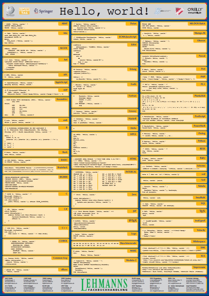Anmerkung zum Posterinhalt: Bei der Entwicklung des Posters mussten einige harte Entscheidungen getroffen werden. Einerseits wollten wir natürlich die für uns wichtig erscheinenden Sprachen so umfangreich wie möglich repräsentiert wissen, aber andererseits die Spezifika der Sprachen nicht verlieren. Aus diesen beiden Beweggründen entstand der Konflikt zwischen Platzbedarf und typischer oder notwendiger Formatierung des Codes.