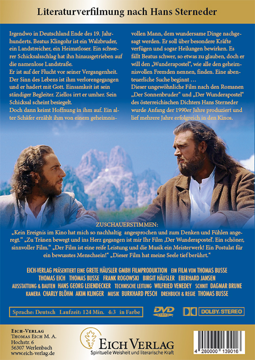 Diese Anfang der 1990er Jahre produzierte Romanverfilmung der beiden Romane Hans Sterneders "Der Sonnenbruder" und "Der Wunderapostel" erzählt die Geschichte des Beatus Klingohr und seine Erlebnisse an der Seite des "Wunderapostels". Dabei beeindrucken ebenso die wundervollen Naturaufnahmen, die liebevolle Gestaltung und die kraftvolle Musik. Der Film ist wie die Bücher - voller Schönheit, Weisheit und Tiefe."Der Wunderapostel" wurde konzipiert als Gegenstück zu Action-, Horroroder Klamaukfilmen und sollte dem Zuschauer die Möglichkeit bieten, sich auch im Filmtheater mit geistigen Werten auseinanderzusetzen. 1993 hatte er Premiere und lief mehrere Jahre erfolgreich in den Kinos.