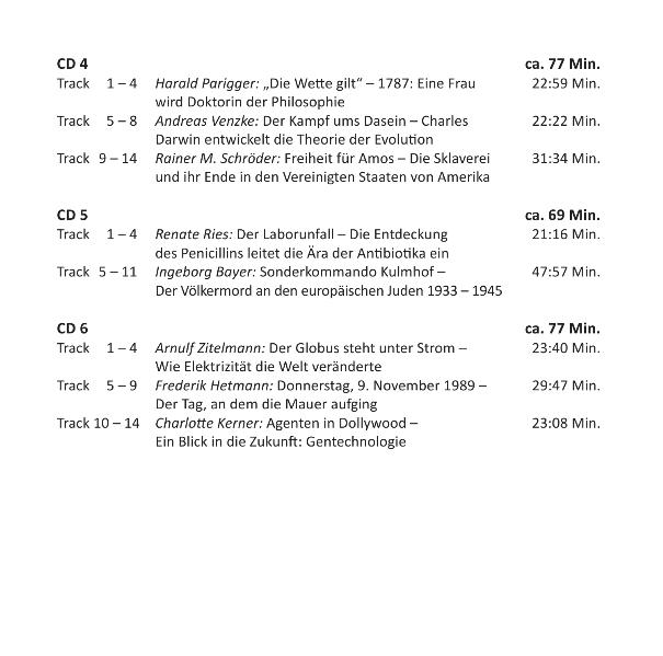 Spannende Streifzüge durch die Weltgeschichte von der Vorzeit bis zur Gegenwart. Von großen Erfindungen, Entdeckungen und Eroberungen wird ebenso erzählt wie von stillen Momenten, die den Weg der Menschheit geprägt haben. Die jungen Hörer erfahren, wie der Mensch den Ackerbau entdeckte, wer Karl der Große war, was am Tag des Mauerfalls passierte und vieles mehr.