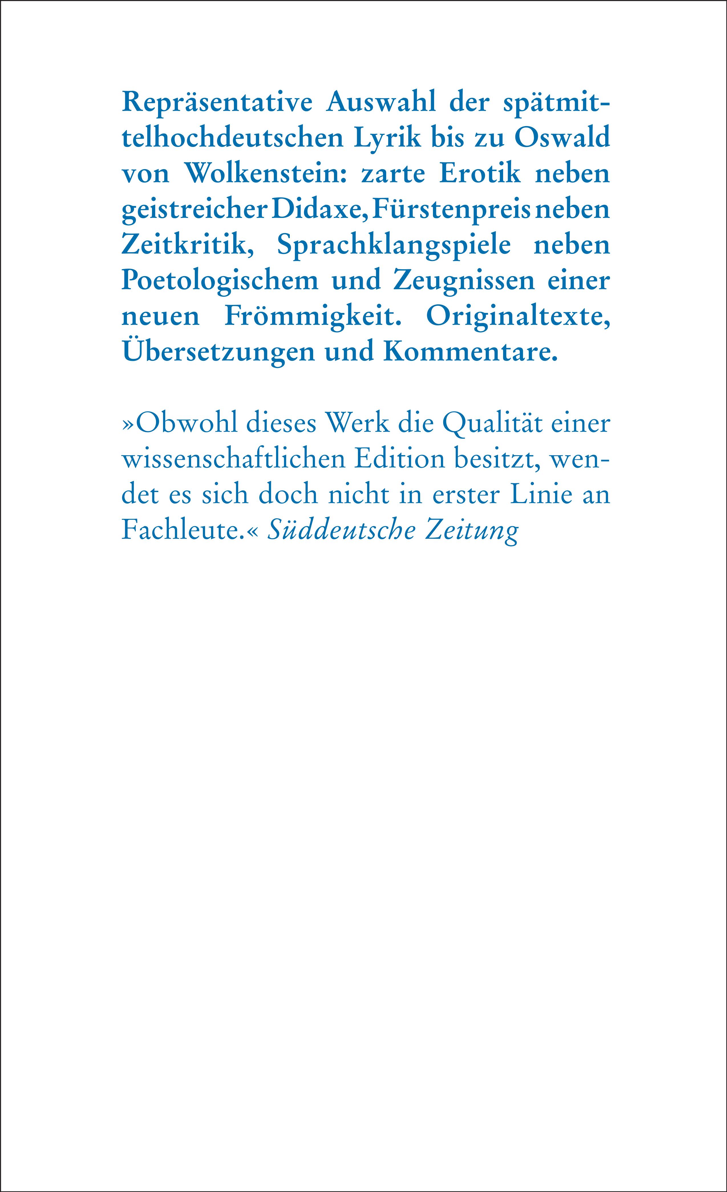 * Repräsentative Auswahl der spätmittelhochdeutschen Lyrik von der höfischen Lyrik bis zu Oswald von Wolkenstein.