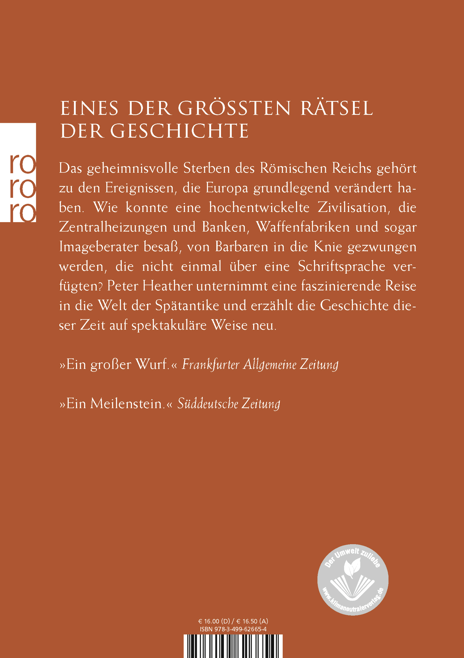 Das geheimnisvolle Sterben des Römischen Reichs gehört zu den Ereignissen, die Europa grundlegend verändert haben. Wie konnte eine hochentwickelte Zivilisation, die Zentralheizungen und Banken, Waffenfabriken und sogar Imageberater besaß, von Barbaren in die Knie gezwungen werden, die nicht einmal über eine Schriftsprache verfügten? Peter Heather unternimmt eine faszinierende Reise in die Welt der Spätantike und erzählt die Geschichte dieser Zeit auf spektakuläre Weise neu.