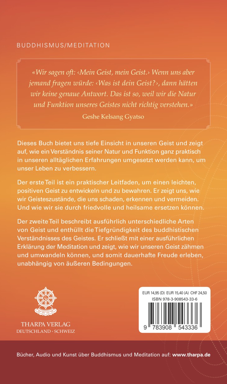Dieses Buch bietet uns tiefe Einsicht in unseren Geist und zeigt auf, wie ein Verständnis seiner Natur und Funktion ganz praktisch in unseren alltäglichen Erfahrungen umgesetzt werden kann, um unser Leben zu verbessern. Der erste Teil ist ein praktischer Leitfaden, um einen leichten, positiven Geist zu entwickeln und zu bewahren. Er zeigt uns, wie wir Geisteszustände, die uns schaden, erkennen und vermeiden und wie wir sie durch friedvolle und heilsame ersetzen können. Der zweite Teil beschreibt ausführlich unterschiedliche Arten von Geist und enthüllt die Tiefgründigkeit des buddhistischen Verständnisses des Geistes. Er schließt mit einer ausführlichen Erklärung der Meditation und zeigt, wie wir unseren Geist zähmen und umwandeln können und somit dauerhafte Freude erleben, unabhängig von äußeren Bedingungen.
