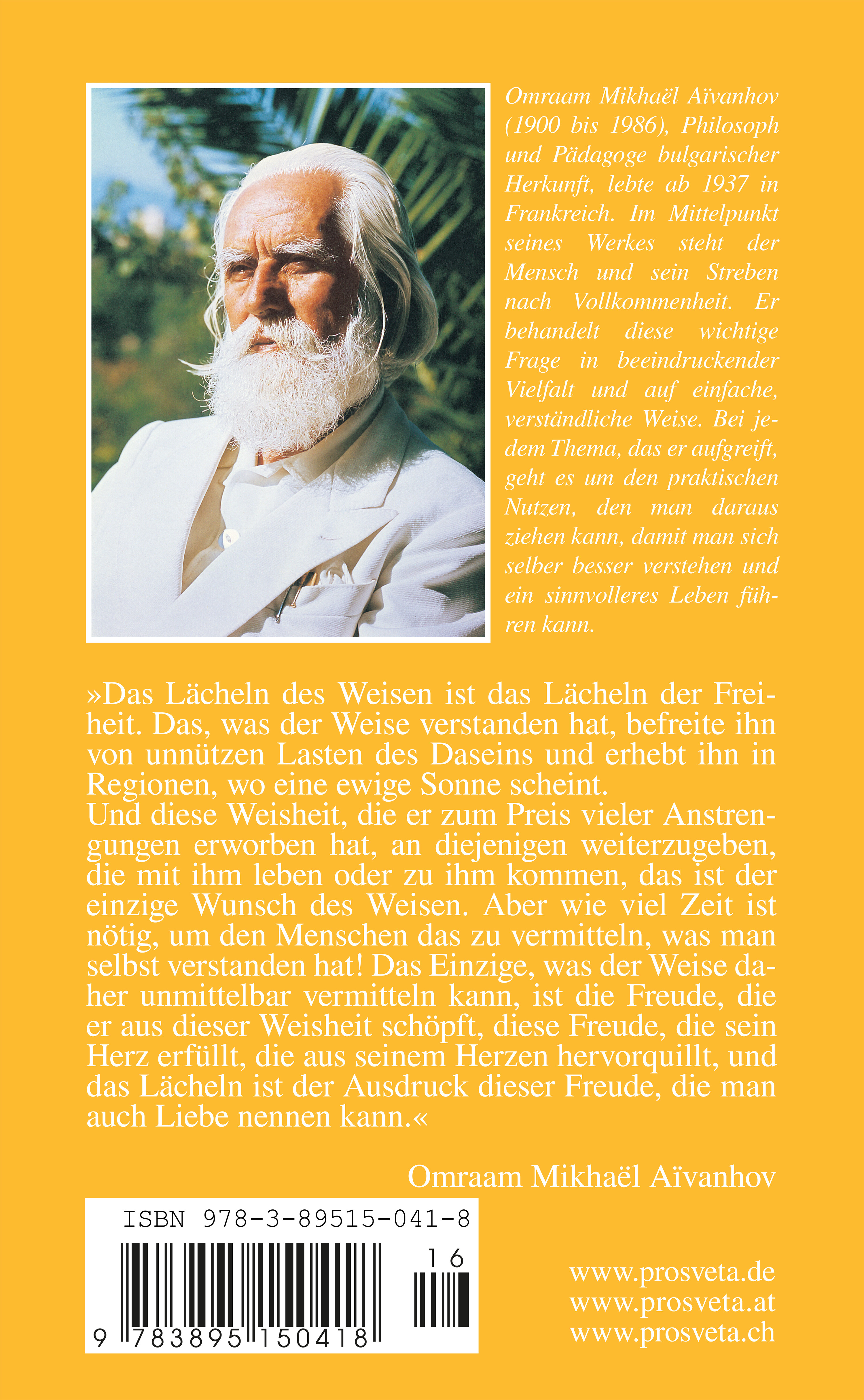 Omraam Mikhaël Aïvanhov war ein großer Philosoph, geistiger Meister und Eingeweihter. Als warmherziger, einfühlsamer und humorvoller Lehrer war er ein lebendiges Vorbild, das durch sein selbstloses, zugängliches und brüderliches Verhalten überzeugte. Er strebte an, alle Menschen bei ihrer persönlichen Entwicklung zu begleiten - so wie ein Bergführer seine Kameraden sicher bis auf den höchsten Gipfel führt.Das Gedankengut, das Omraam Mikhaël Aïvanhov verbreitet hat, bietet zahlreiche Methoden und einen klaren, begehbaren Weg zu größerer Vollkommenheit und mehr Lebensglück. In wohltuend einfacher Sprache erklärt er alle wichtigen Zusammenhänge des Lebens und ist gerade bei den Fragen unserer heutigen Zeit wegweisend. Ob es um die Bewältigung des Alltags geht, um die Gesundheit, die Ethik, die Liebe, die Sexualität oder um tiefgründige, philosophische Themen - stets sind seine Antworten überraschend klar und hilfreich.