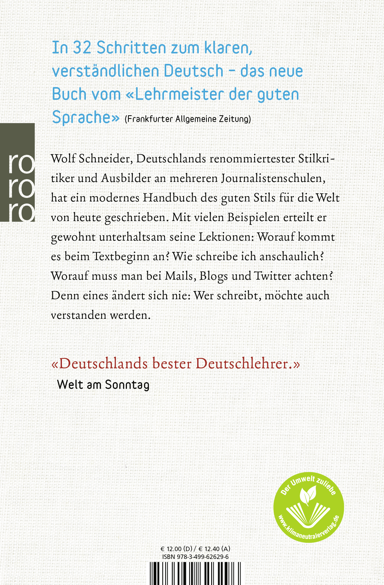 Wolf Schneider, Deutschlands renommiertester Stilkritiker und Ausbilder an mehreren Journalistenschulen, hat ein modernes Handbuch des guten Stils für die Welt von heute geschrieben. Mit vielen Beispielen erteilt er gewohnt unterhaltsam seine Lektionen: Worauf kommt es beim Textbeginn an? Wie schreibe ich anschaulich? Worauf muss man bei Mails, Blogs und Twitter achten? Denn eines ändert sich nie: Wer schreibt, möchte auch verstanden werden.