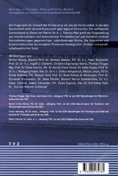 Die Frage nach der Zukunft der Kirche ist so alt wie die Kirche selbst. In pluraler Gesellschaft stellt sie sich heute unter ganz eigenen Vorzeichen. Der Sammelband zu Ehren von Pfarrer Dr. h. c. Thomas Wipf greift die Fragestellung aus interdisziplinärer und ökumenischer Perspektive auf und diskutiert zentrale Herausforderungen gegenwärtiger, zukunftsfähiger Kirche. Die Autorinnen und Autoren beleuchten das komplexe Thema aus theologischer, kirchen- und gesellschaftspolitischer Sicht. Mit Beiträgen von Michel Bollag, Bischof Prof. Dr. Michael Bünker, Pfr. Dr. h. c. Peter Bukowski, Prof. Dr. Dr. h. c. Ingolf U. Dalferth, Christine Egerszegi-Obrist, Thomas Flügge, Mgr. Prof. Dr. Peter Henrici, Pfr. Dr. Martin Ernst Hirzel, Dr. Hella Hoppe, Prof. Dr. Dr. h. c. Wolfgang Huber, Rev. Dr. Dr. h. c. Clifton Kirkpatrick, Rifa'at Lenzin, PD Dr. Frank Mathwig, Pfr. Rüdiger Noll, Prof. Dr. René Pahud de Mortanges, Prof. Dr. Elisabeth Parmentier, Dr. Silvia Pfeiffer, Bischof Martin Schindehütte, Dr. h. c. Peter Schmid, André Schneider, Pfr. Paolo Tognina, Rev. Dr. Olaf Fykse Tveit, Dr. Eveline Widmer-Schlumpf.