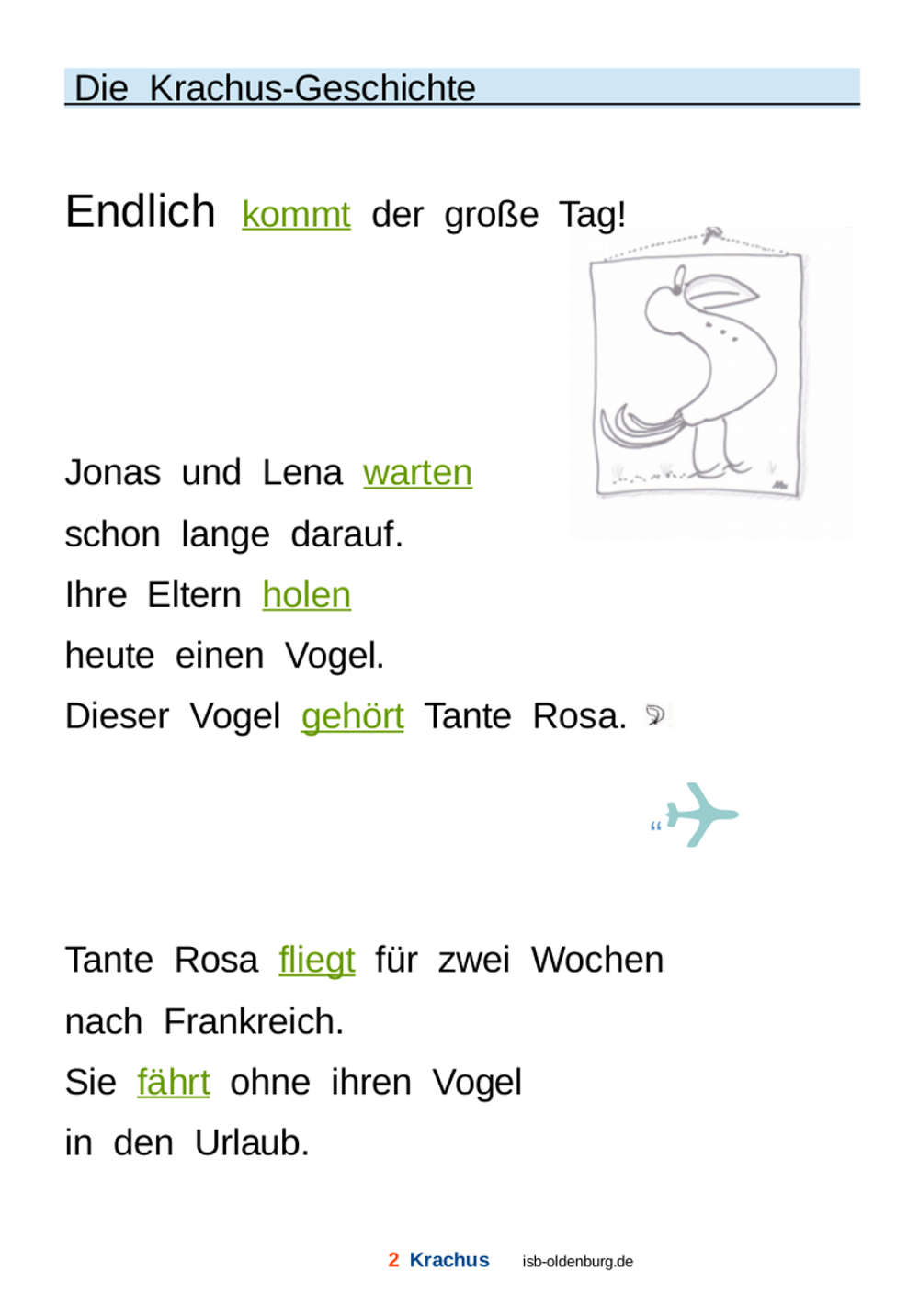 Der Papagei Krachus sorgt dafür, dass keine Langeweile beim Lesen aufkommt. Die gezielten Übungen sind in die Rahmenhandlung eingebettet. Es handelt sich um den Übungsschwerpunkt: Konjugation von Verben. Besonderer Wert wird hier auf die häufig weggelassenen oder verschluckten Verb-Endungen gelegt: wir sagen, sie gehen, sie rennen usw. Die Kinder erhalten gezielte Hilfestellungen und überschaubare Informationen (kleine Tabellen und Lösungsteil enthalten). Lesemotivation durch große Schrift.