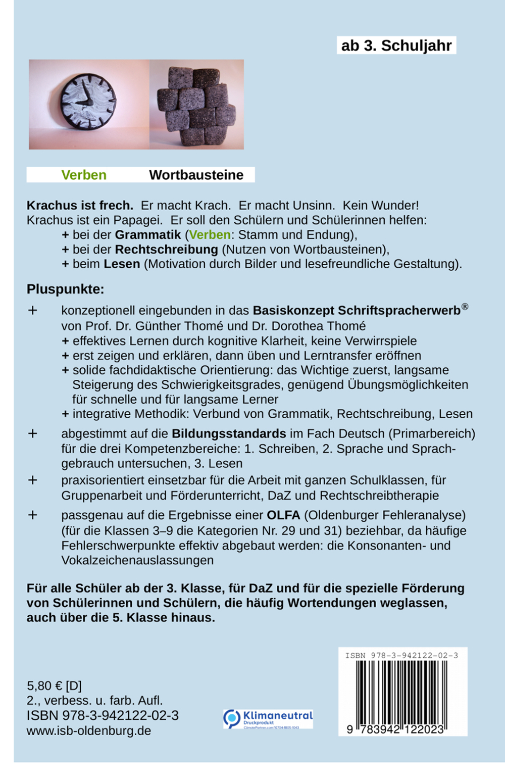 | Schlagworte | Basiskonzept • DAZ • Deutsch als Zweitsprache • Deutsch; Übungen (Grundschule) • Deutschunterricht • Fördermaterial • Förderung • Förderunterricht • Grammatik • große Schrift • klare Aufgaben • Konjugation • Legasthenie • Lernmaterial • Leseförderung • Lösungsteil • LRS • Material für den Rechtschreib- und Grammatikunterricht • Material für den Rechtschreib- und Grammatikunterricht • Methodik des Schriftspracherwerbs • Oldenburger Fehleranalyse kompatibel (Kat. 29 und 31) • OLFA-Kategorien 29 und 31 (Konsonant/Vokal fehlt) • Passgenaues Fördern • Psycholinguistik • Rechtschreibförderung • Rechtschreibprobleme • Rechtschreibung • Verbendungen • Verb-Endungen |