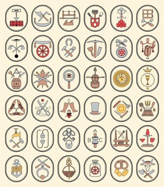 Eine PDF-Datei enthält 36 schöne alte farbige Zunftzeichen, Innungszeichen, Handwerkszeichen, Berufswappen mit Beschreibung und Erläuterungen zu den Berufen. Außerdem werden diese Grafiken in hervorragender Qualität in den Formaten jpg, png sowie den Vektorgrafikformaten, ai = Adobe Illustrator, cdr = CorelDraw ab Version 11, svg = Inkscape, cdr xar = XaraXTREME mitgeliefert.