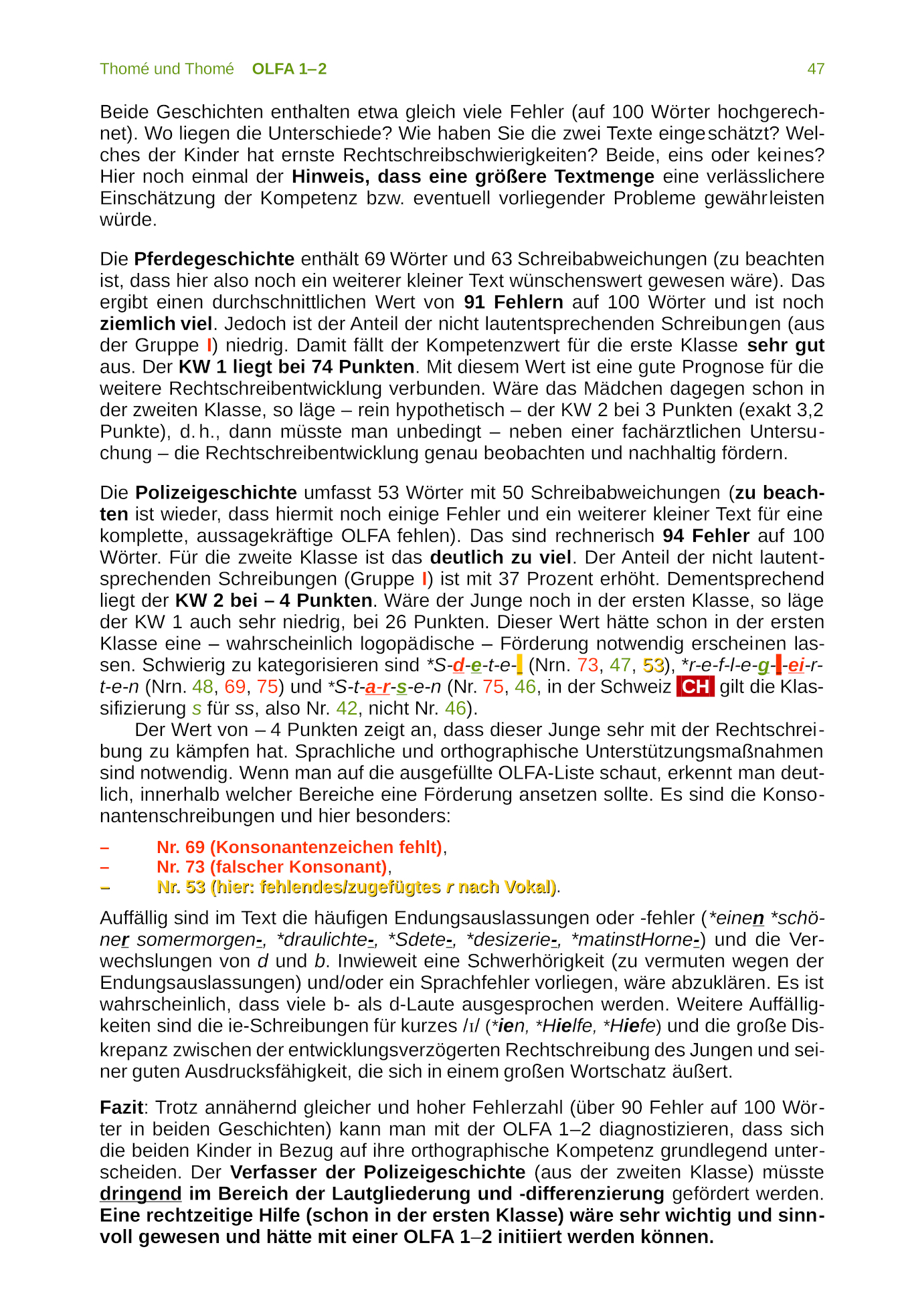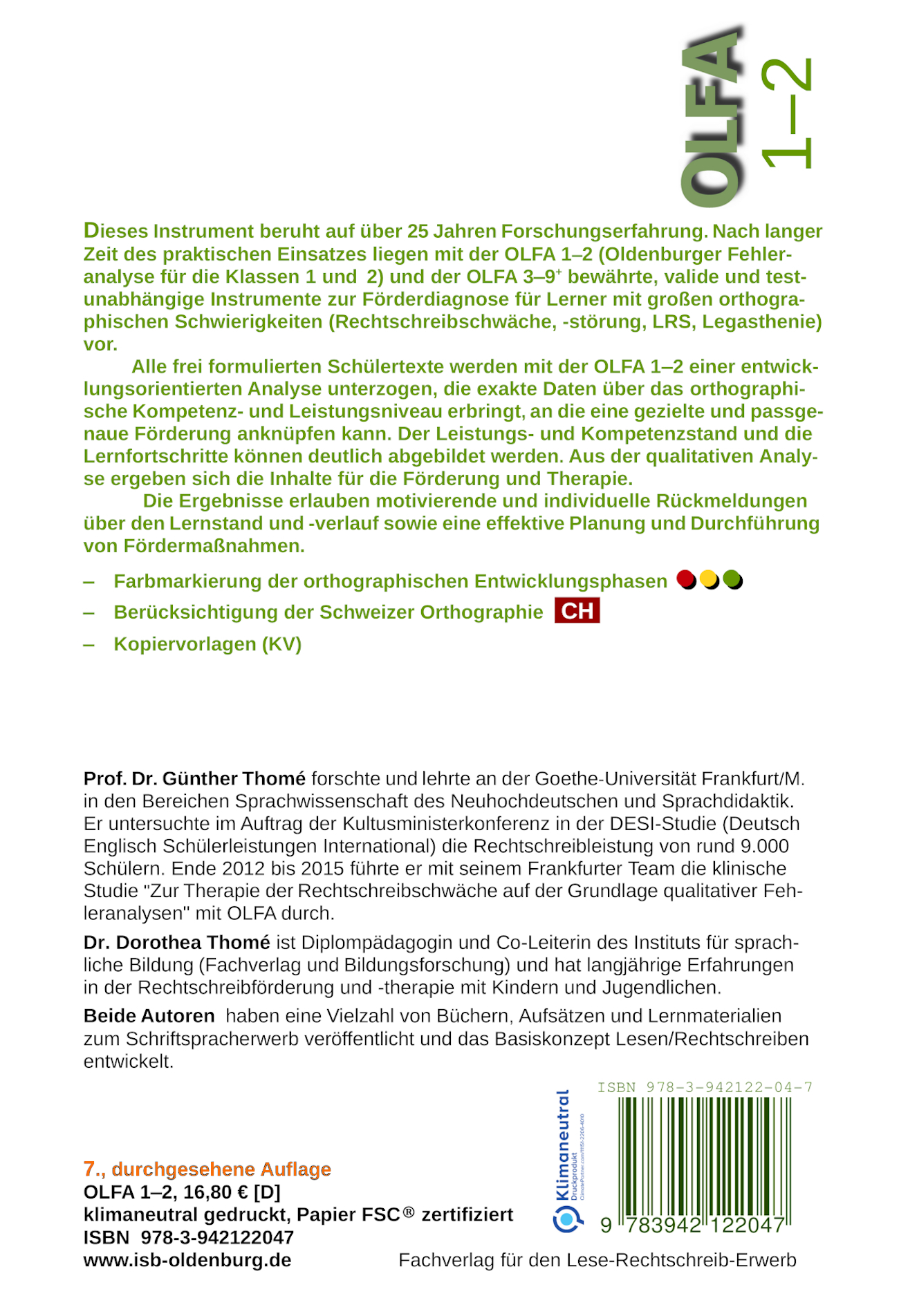 REZENSIONSZITAT "Mit der OLFA 1-2 lässt sich auf Basis freier Texte eine sehr differenzierte Fehleranalyse durchführen. (...) Die OLFA 1-2 ist ein gut durchdachtes, informatives Instrument, das ein wenig Einarbeitung benötigt, dann aber eine sehr differenzierte Fehleranalyse bietet." (Rainer Mohr, Legasthenietherapie-info.de, Newsletter 02/2019) REZENSIONSZITAT (bezieht sich auf eine Vorgängerauflage) "Die pädagogischen und fachdidaktischen Vorteile von OLFA sind (vgl. Thomé und Thomé 2009) in den folgenden Punkten zusammengefasst: 'echte Förderdiagnostik' ..., Flexibilität des Einsatzes ..., keine Testsituation ... Motivationsförderung'." (A. Sasse und R. Valtin (2014): Rechtschreibdiagnose für freie Texte. Die Anwendung der Oldenburger Fehleranalyse (OLFA). In "Deutsch differenziert 4/2014, S. 19) "Thomé und Thomé ist es gelungen, eine durchdachte qualitative Fehleranalyse für Schüler der ersten und zweiten Klasse zu konstruieren. Insbesondere die Möglichkeit des Berechnens der einzelnen Kennwerte kann sehr überzeugen. (.) Insgesamt handelt es sich bei der OLFA 1-2 um ein sehr gelungenes Diagnoseinstrument für die qualitative Fehleranalyse." (Dipl.-Psych. Rainer Mohr, Journal für Legasthenietherapie, Ausgabe 4/2014)