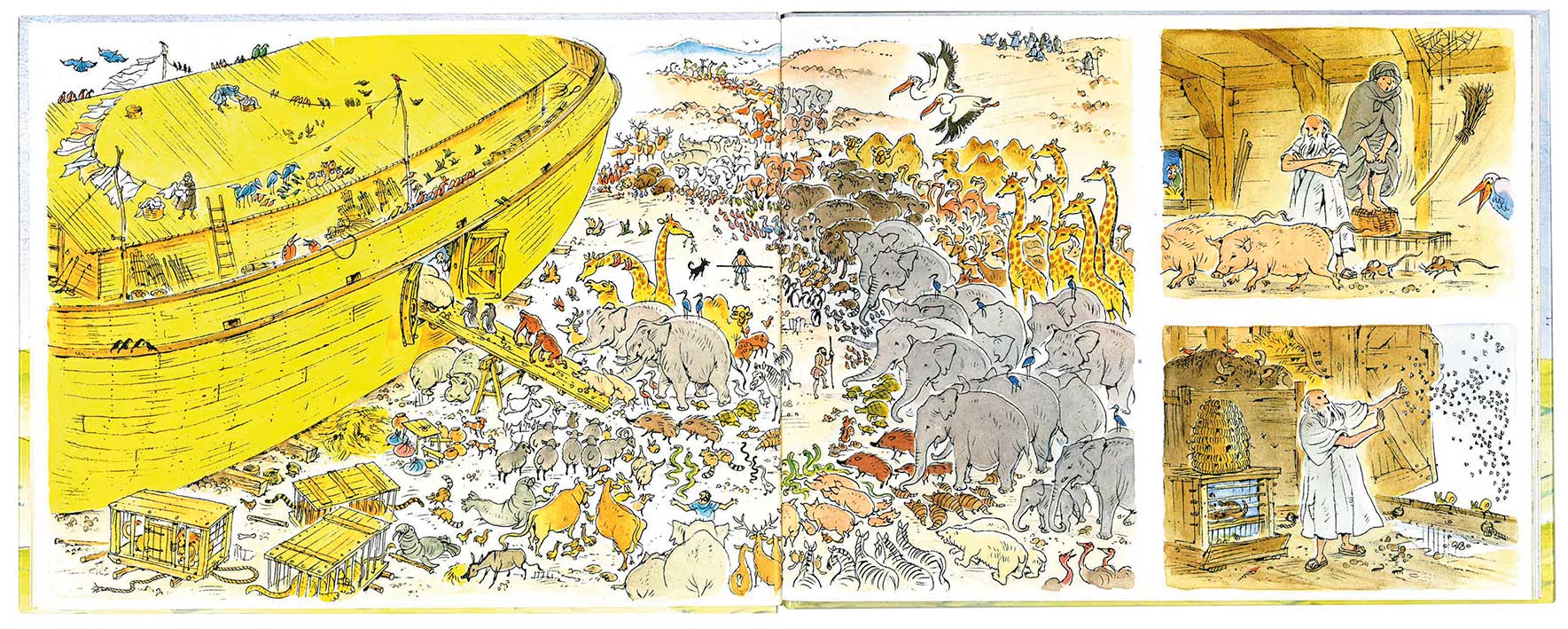 So ein riesiges Schiff - und das mitten auf dem Land! Aus allen Richtungen rennen und kriechen, hüpfen und flattern die Tiere herbei, um in der Arche Schutz vor der angekündigten großen Flut zu finden. Was für ein wildes Durcheinander von Köpfen und Körpern, Hufen und Tatzen, Federn und Fellen! Kein Wunder, dass der Elefant aus Versehen auf den Schwanz einer Maus tritt und ein anderes Mäuschen vergeblich versucht, den Dickhäuter wegzuschubsen ...