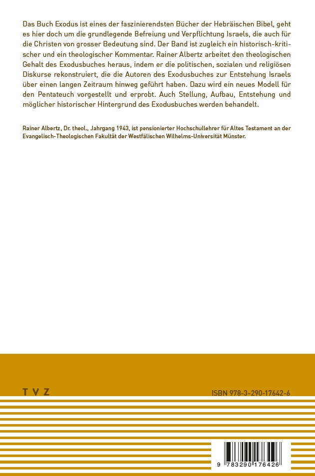 Das Buch Exodus ist eines der faszinierendsten Bücher der Hebräischen Bibel, geht es hier doch um die grundlegende Befreiung und Verpflichtung Israels, die auch für die Christen von grosser Bedeutung sind. Der Band ist zugleich ein historisch-kritischer und ein theologischer Kommentar. Rainer Albertz arbeitet den theologischen Gehalt des Exodusbuches heraus, indem er die politischen, sozialen und religiösen Diskurse rekonstruiert, die die Autoren des Exodusbuches zur Entstehung Israels über einen langen Zeitraum hinweg geführt haben. Dazu wird ein neues Modell für den Pentateuch vorgestellt und erprobt. Auch Stellung, Aufbau, Entstehung und möglicher historischer Hintergrund des Exodusbuches werden behandelt.