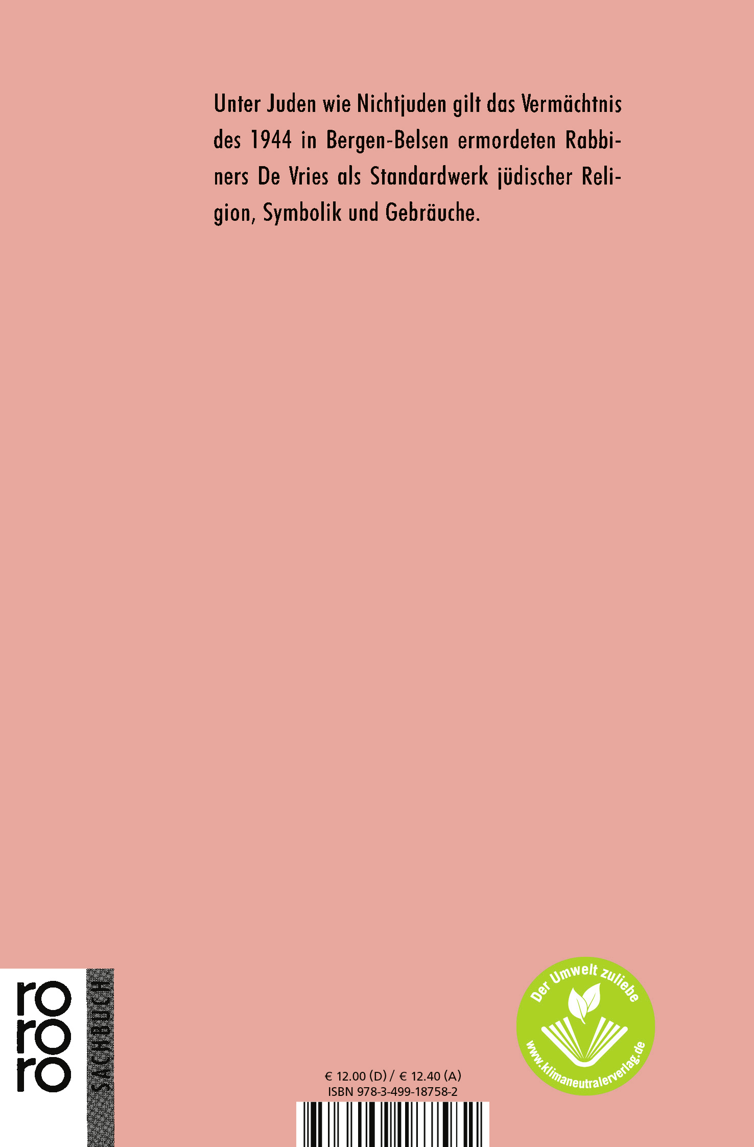 Der Rabbiner S. Ph. De Vries zählte zu den ersten, die das lebhafte Interesse zahlreicher Nichtjuden an Leben und Traditionen jüdischer Mitbürger bemerkten und richtig bewerteten. Diesem Inter¬esse kam De Vries mit seiner Veröffentlichung von jüdischen Bräuchen und Symbolen entgegen.In der Tat hat De Vries mit seinem in nichtjüdischen wie in jüdischen Kreisen viel gelesenen Werk seinerzeit großen Einfluß auf das geistige Leben ausgeübt.Er tat dies in der Hoffnung, daß die Beschreibung äußerer Formen jüdischen religiösen Lebens auch einiges vom inneren Wesen und tiefe¬ren Sinn des Judentums offenbaren und verständlich machen würde.Die Anschauungen des Autors sind tief in jüdisch-orthodoxer Über¬lieferung verwurzelt. Er vermittelt sie mit warmer Menschlichkeit und mit Begeisterung für das Thema.
