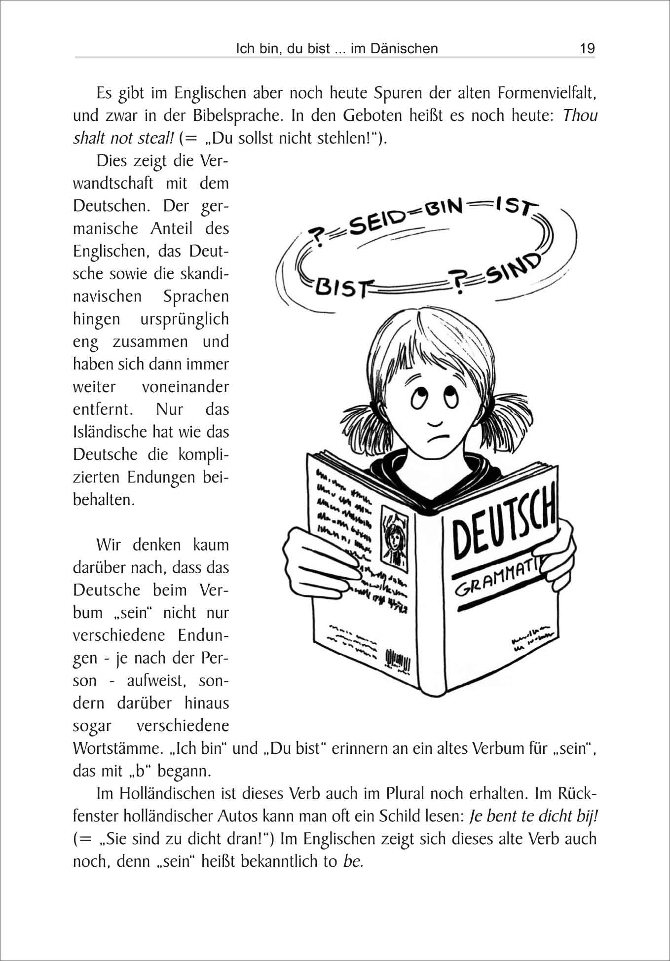 Allein schon die Aussprache!, Ich bin, du bist. im Dänischen, Unisex, Die merkwürdige Artikelstellung, Mir oder mich?, Die lieben Verwandten, Die Zahlen, Du oder Si?, Sprachreform und Demokratie, Ist Dänsich eine Art Plattdeutsch?, Zusammenhänge zwischen Dänisch und Deutsch, Deutsch-dänischer Sprachstreit in der Geschichte, Zusammenhänge zwischen Dänisch und Englisch, Deutsch-dänischer Lautvergleich, Vorsicht, Verwechslungsgefahr!, Bildhafte Wendungen, Übersetzung ist oft Glückssache.