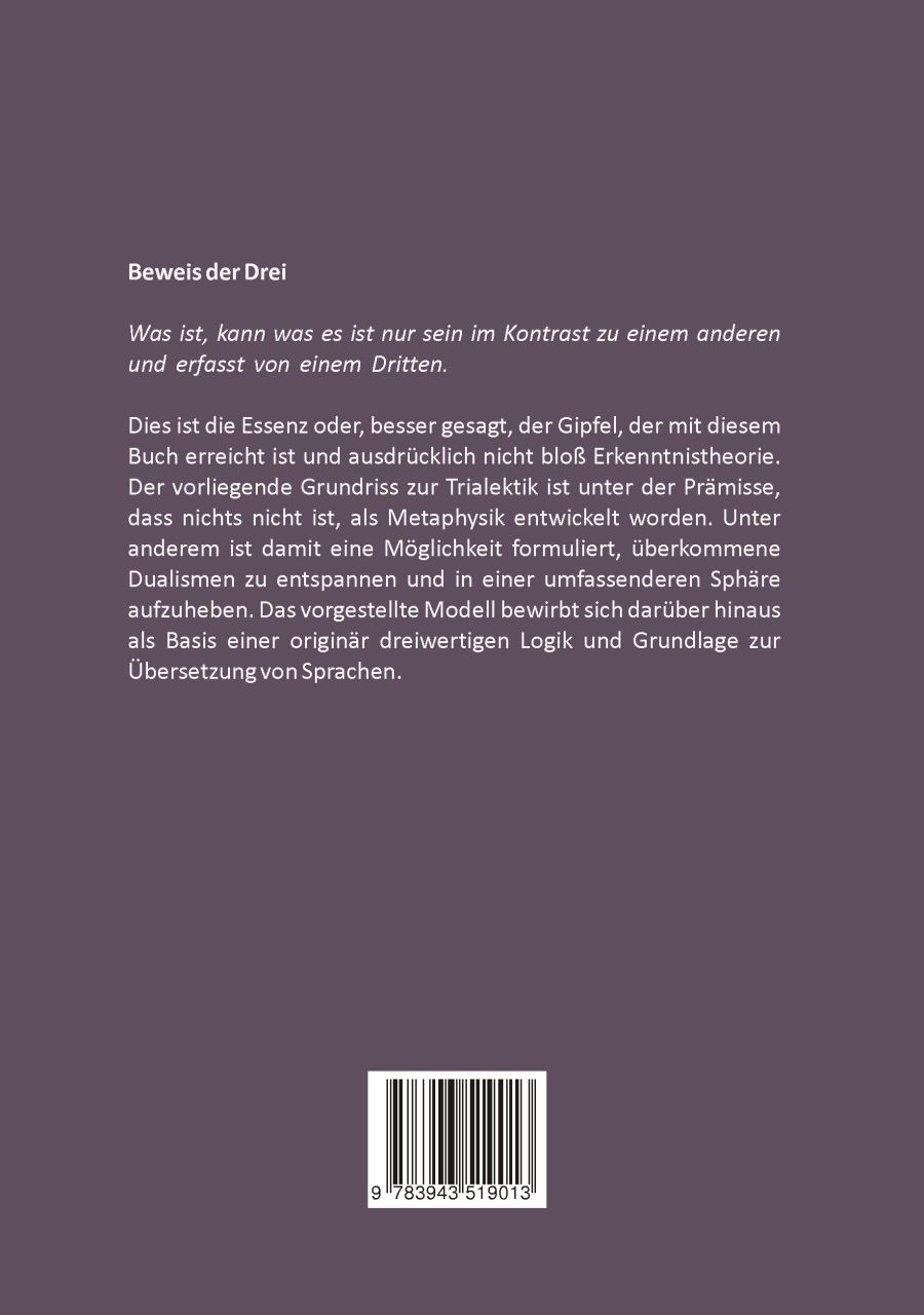 Dieses Buch handelt vom kleinsten gemeinsamen Nenner, auf den man die Welt bringen kann. Er heißt drei. Etwa zwei Drittel des Buches leuchten ein wenig das gedankliche Umfeld aus, in dem sich die Ausführung dieses Gedankens entwickelte. Das übrige Drittel und den Kern des Buches bildet die Fassung dieses Gedankens selbst, der Grundriss zur Trialektik. Das an der Drei etwas dran sein muss, ist sozusagen ein alter Hut. Das Neue hier ist, dass die Drei systematisch grundlegend in den Griff genommen und als Metaphysik, Ontologie beziehungsweise einheitliche Theorie und Grundlage einer Logik entwickelt wird. Mit wenigen Grundannahmen sind einige weitreichende Implikationen notwendig verknüpft. Bestimmte Bedeutungen des Satzes "Tertium non datur" müssen aufgegeben werden. Der "Beweis der Drei" formuliert die grundlegenden Bedingungen, unter denen dieser Satz überhaupt noch aufrechterhalten werden kann. Die Überwindung der überkommenen Vorstellungen, Begriffe und Wahrnehmungen von Raum und Zeit rückt vielleicht etwas weiter in greifbare Nähe.