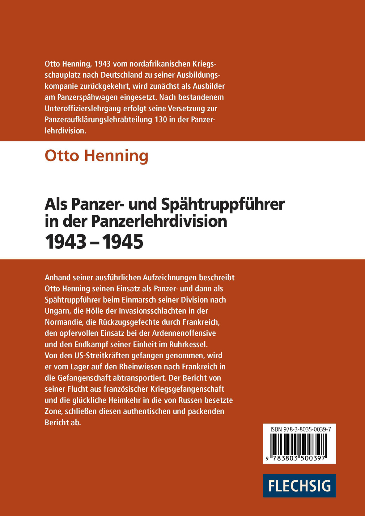 Otto Henning, 1943 vom nordafrikanischen Kriegsschauplatz nach Deutschland zu seiner Ausbildungskompanie zurückgekehrt, wird zunächst als Ausbilder am Panzerspähwagen eingesetzt. Nach bestandenem Unteroffizierslehrgang erfolgt seine Versetzung zur Panzer-Aufklärungs-Lehrabteilung 130 in der Panzer-Lehrdivision. Anhand seiner ausführlichen Aufzeichnungen beschreibt Otto Henning seinen Einsatz als Panzer- und dann als Spähtruppführer beim Einmarsch seiner Division nach Ungarn, die Hölle der Invasionsschlachten in der Normandie, die Rückzugsgefechte durch Frankreich, den opfervollen Einsatz bei der Ardennen-Offensive und den Endkampf seiner Einheit im Ruhr-Kessel. Von den US-Streitkräften gefangen genommen, wird er vom Rheinwiesen-Lager nach Frankreich in die Gefangenschaft abtransportiert. Der Bericht von seiner Flucht aus französischer Kriegsgefangenschaft und die glückliche Heimkehr in die von Russen besetzte Zone, schließen diesen authentischen und packenden Bericht ab.