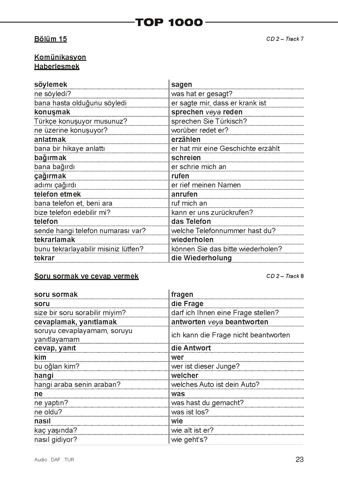 Der Audiotrainer Deutsch als Fremdsprache enthält über 1000 Stichwörter und Beispielsätze auf 2 Audio/mp3 CDs. Er ist zweisprachig (Türkisch-Deutsch) aufgebaut, nach Themen geordnet und von Muttersprachlern gesprochen. Der Wortschatz orientiert sich am europäischen Referenzrahmen Niveau A1.