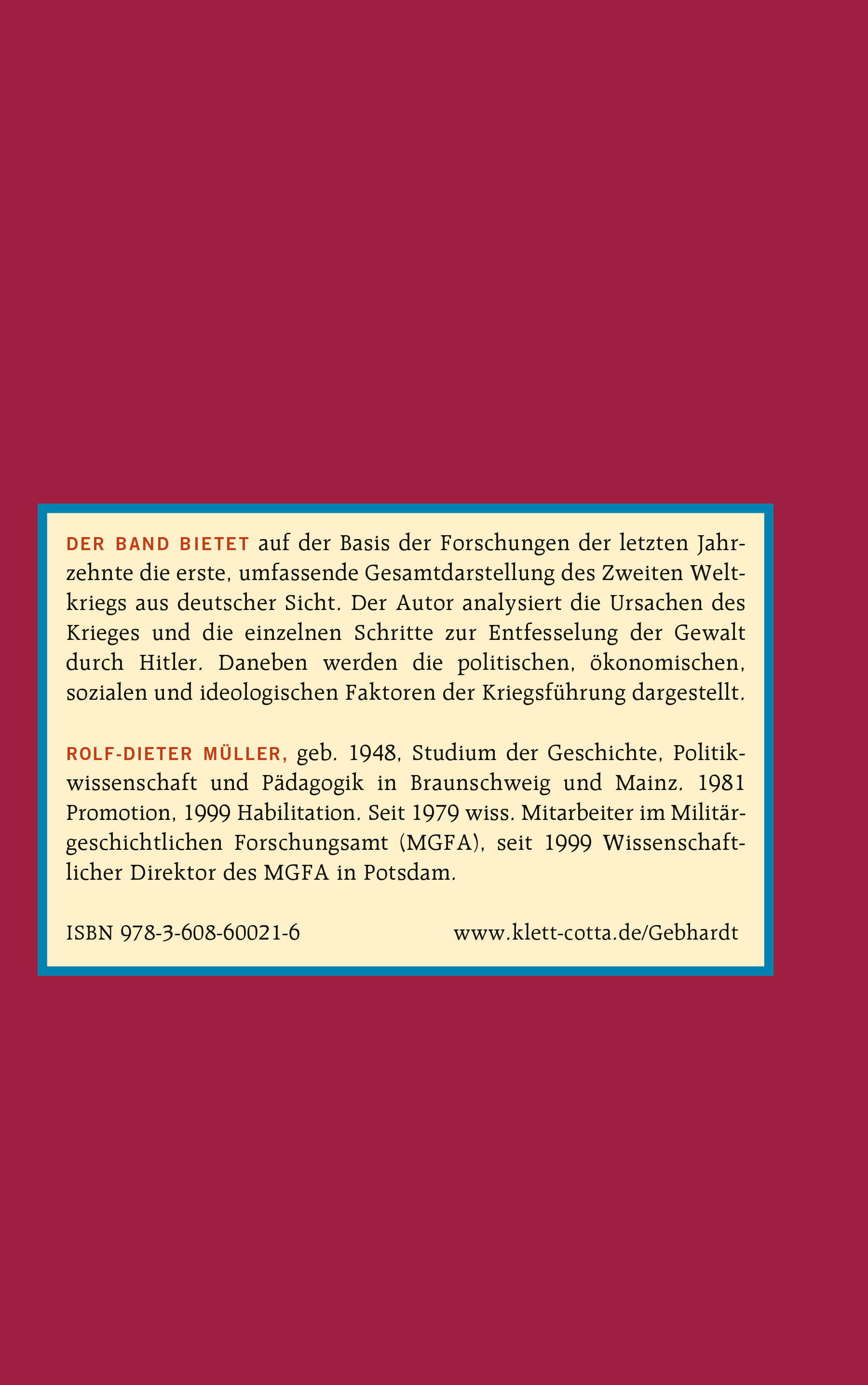 Der Band bietet auf der Basis der Forschungen der letzten Jahrzehnte die erste, umfassende Gesamtdarstellung des Zweiten Weltkriegs aus deutscher Sicht.