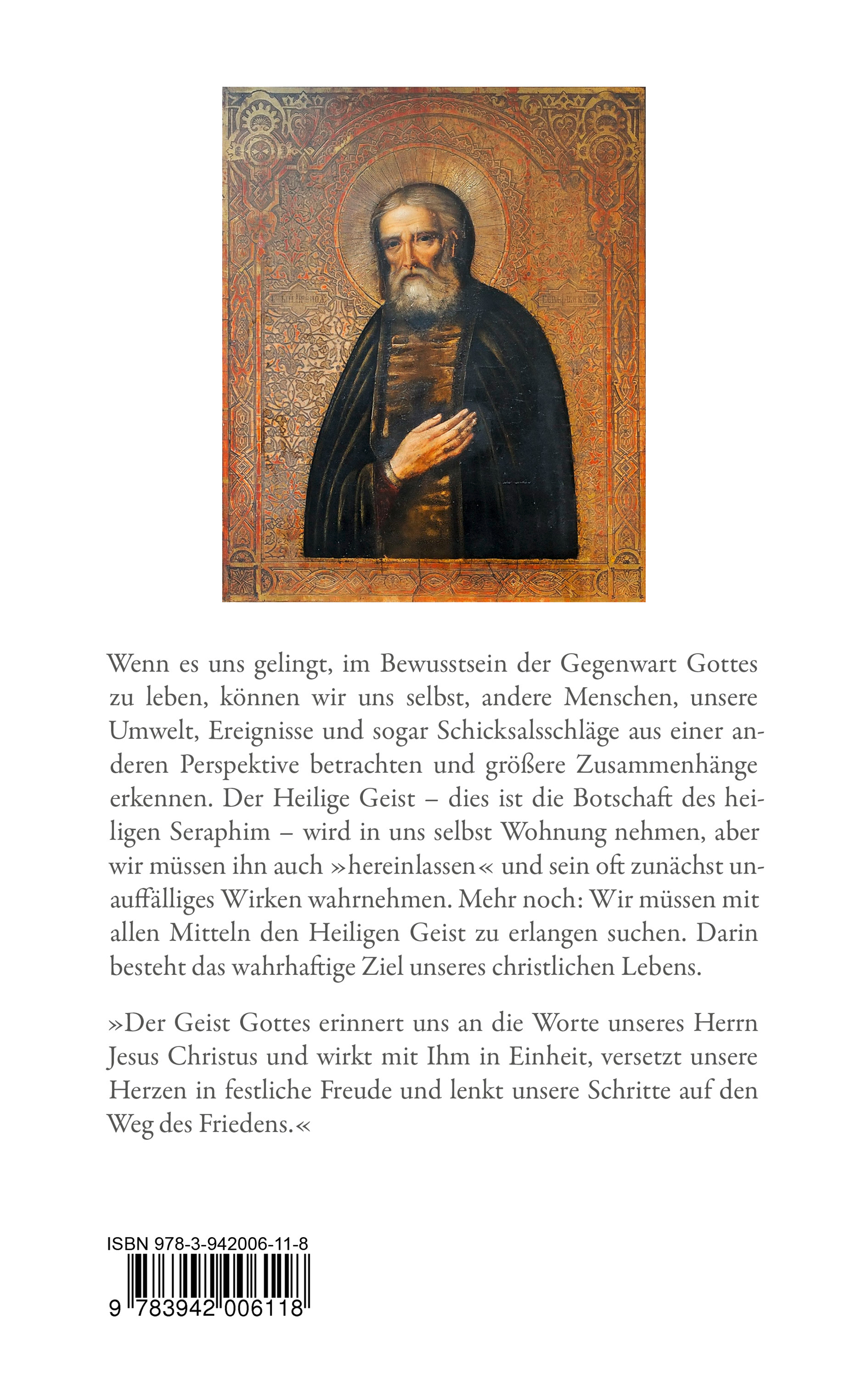 Wenn es uns gelingt, im Bewusstsein der Gegenwart Gottes zu leben, können wir uns selbst, andere Menschen, unsere Umwelt, Ereignisse und sogar Schicksalsschläge, aus einer anderen Perspektive betrachten und größere Zusammenhänge erkennen.Der Heilige Geist - dies ist die Botschaft des heiligen Seraphim - wird in uns selbst Wohnung nehmen, aber wir müssen ihn auch »hereinlassen« und sein oft zunächst unauffälliges Wirken wahrnehmen. Mehr noch: Wir müssen mit allen Mitteln den Heiligen Geist zu erlangen suchen. Darin besteht das wahrhaftige Ziel unseres christlichen Lebens.»Der Geist Gottes erinnert uns an die Worte unseres Herrn Jesus Christus und wirkt mit Ihm in Einheit, versetzt unsere Herzen in festliche Freude und lenkt unsere Schritte auf den Weg des Friedens.«