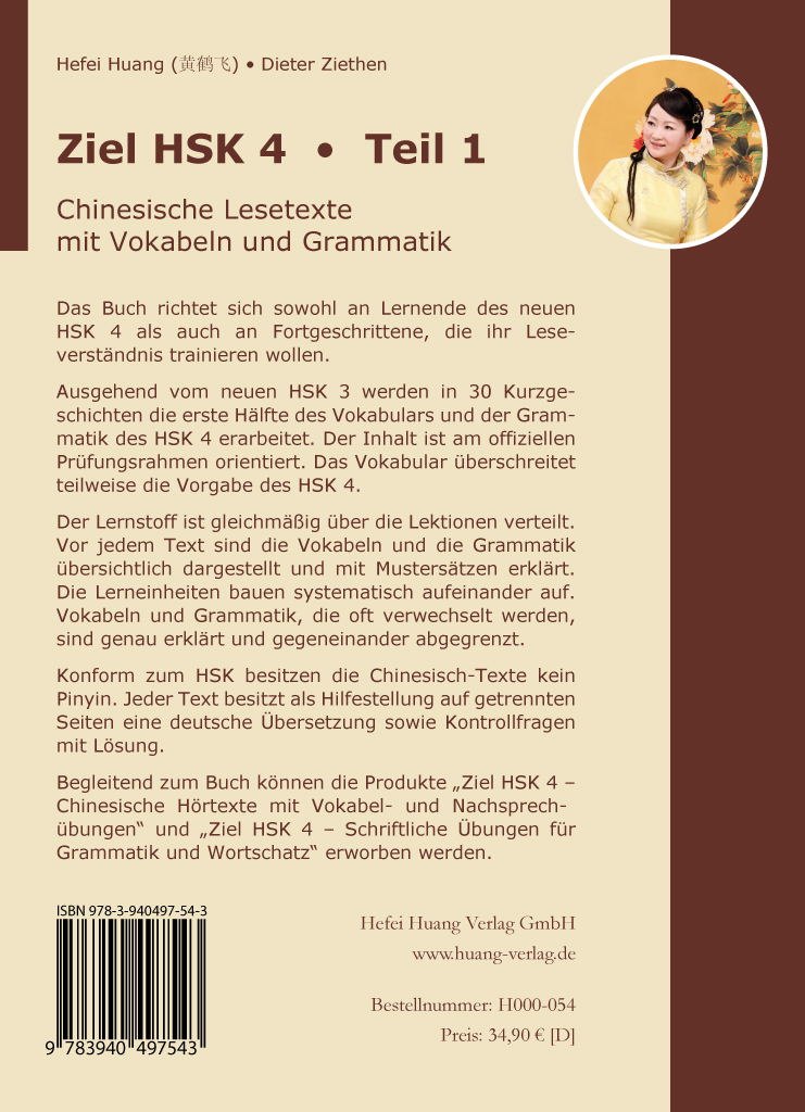 Ausgehend vom neuen HSK 3 werden in 30 Kurzgeschichten die erste Hälfte des Vokabulars und der Grammatik des HSK 4 erarbeitet. Der Inhalt ist am offiziellen Prüfungsrahmen orientiert. Das Vokabular überschreitet teilweise die Vorgabe des HSK 4.