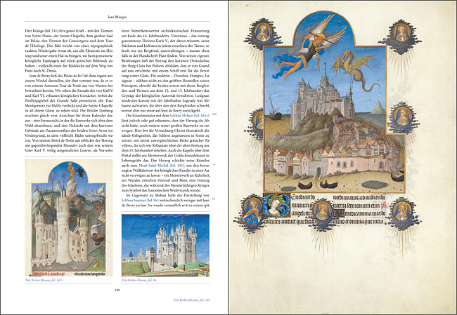 Die Kunstbuch-Edition zeigt alle 66 ganzseitigen Miniaturen im Originalformat von 21,3 × 29,2 cm, sowie zahlreiche Seiten mit spaltenbreiten Miniaturen und ausgewählte Textseiten mit üppigem Initial- und Randschmuck aus der Handschrift. Auf 288 Seiten führen ausführliche Bildbeschreibungen in die Handschrift und die Zeit ihrer Entstehung im 15. Jahrhundert ein. Spannend geschriebene Beiträge zu den drei genialen Brüdern Limburg, ihren künstlerischen Nacheiferern und zum Auftraggeber aus der Feder der Handschriftenexperten Emmanuelle Toulet, Inès Villela-Petit, Marie Jacob, Jean Mesqui, Margaret Scott und Patricia Stirnemann geben den aktuellen Forschungsstand wieder. Beiträge zu Architektur und Mode beleuchten die Handschrift unter ganz spezifischen Aspekten.