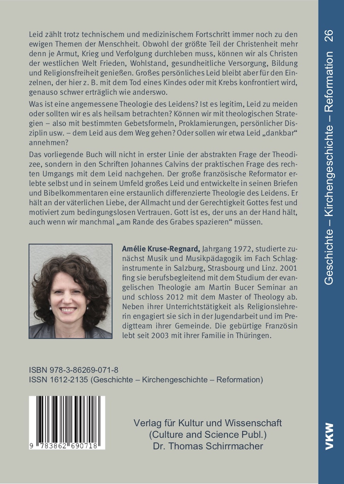 Die bisher umfachgreichste Darstellung der Theologie des Leidens des Schweizer Reformators Johannes Calvin - erarbeitet vor allem aus seinen Briefen und Bibelkommentaren. Leid zählt trotz technischem und medizinischem Fortschritt immer noch zu den ewigen Themen der Menschheit. Obwohl der größte Teil der Christenheit mehr denn je Armut, Krieg und Verfolgung durchleben muss, können wir als Christen der westlichen Welt Frieden, Wohlstand, gesundheitliche Versorgung, Bildung und Religionsfreiheit genießen. Großes persönliches Leid bleibt aber für den Einzelnen, der hier z. B. mit dem Tod eines Kindes oder mit Krebs konfrontiert wird, genauso schwer erträglich wie anderswo. Was ist eine angemessene Theologie des Leidens? Ist es legitim, Leid zu meiden oder sollten wir es als heilsam betrachten? Können wir mit theologischen Strategien – also mit bestimmten Gebetsformeln, Proklamierungen, persönlicher Disziplin usw. – dem Leid aus dem Weg gehen? Oder sollen wir etwa Leid „dankbar“ annehmen? Das vorliegende Buch will nicht in erster Linie der abstrakten Frage der Theodizee, sondern in den Schriften Johannes Calvins der praktischen Frage des rechten Umgangs mit dem Leid nachgehen. Der große französische Reformator erlebte selbst und in seinem Umfeld großes Leid und entwickelte in seinen Briefen und Bibelkommentaren eine erstaunlich differenzierte Theologie des Leidens. Er hält an der väterlichen Liebe, der Allmacht und der Gerechtigkeit Gottes fest und motiviert zum bedingungslosen Vertrauen. Gott ist es, der uns an der Hand hält, auch wenn wir manchmal „am Rande des Grabes spazieren“ müssen. Amélie Kruse-Regnard, Jahrgang 1972, studierte zunächst Musik und Musikpädagogik im Fach Schlaginstrumente in Salzburg, Strasbourg und Linz. 2001 fing sie berufsbegleitend mit dem Studium der evangelischen Theologie am Martin Bucer Seminar an und schloss 2012 mit dem Master of Theology ab. Neben ihrer Unterrichtstätigkeit als Religionslehrerin engagiert sie sich in der Jugendarbeit und im Predigtteam ihrer Gemeinde. Die gebürtige Französin lebt seit 2003 mit ihrer Familie in Thüringen.