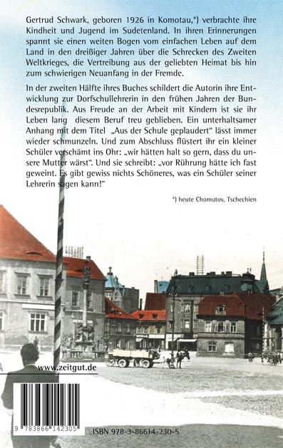 Gertrud Schwark, geborene Böhm, wurde 1926 in Komotau im Sudetenland geboren, heute Tschechische Republik. Sie lebte dort bis zur Umsiedlung 1946, wo sie noch kurz vorher ihre erste Dienstprüfung für das Lehramt an Volksschulen ablegen konnte. Nach der Vertreibung wurde sie zunächst im Landkreis Fulda als Lehrerin eingesetzt, bevor sie 1950 nach Unterrieden im Kreis Witzenhausen kam, wo sie 15 Jahre tätig war. 1965 zog sie nach Baden-Württemberg, wo sie neben ihrem Beruf als Lehrerin auch Pfarrhaushälterin war. Nach ihrer Pensionierung 1982 begann sie, ihre Erinnerungen aufzuschreiben. Gertrud Schwark hat eine Tochter und lebt heute in Göppingen bei Stuttgart.