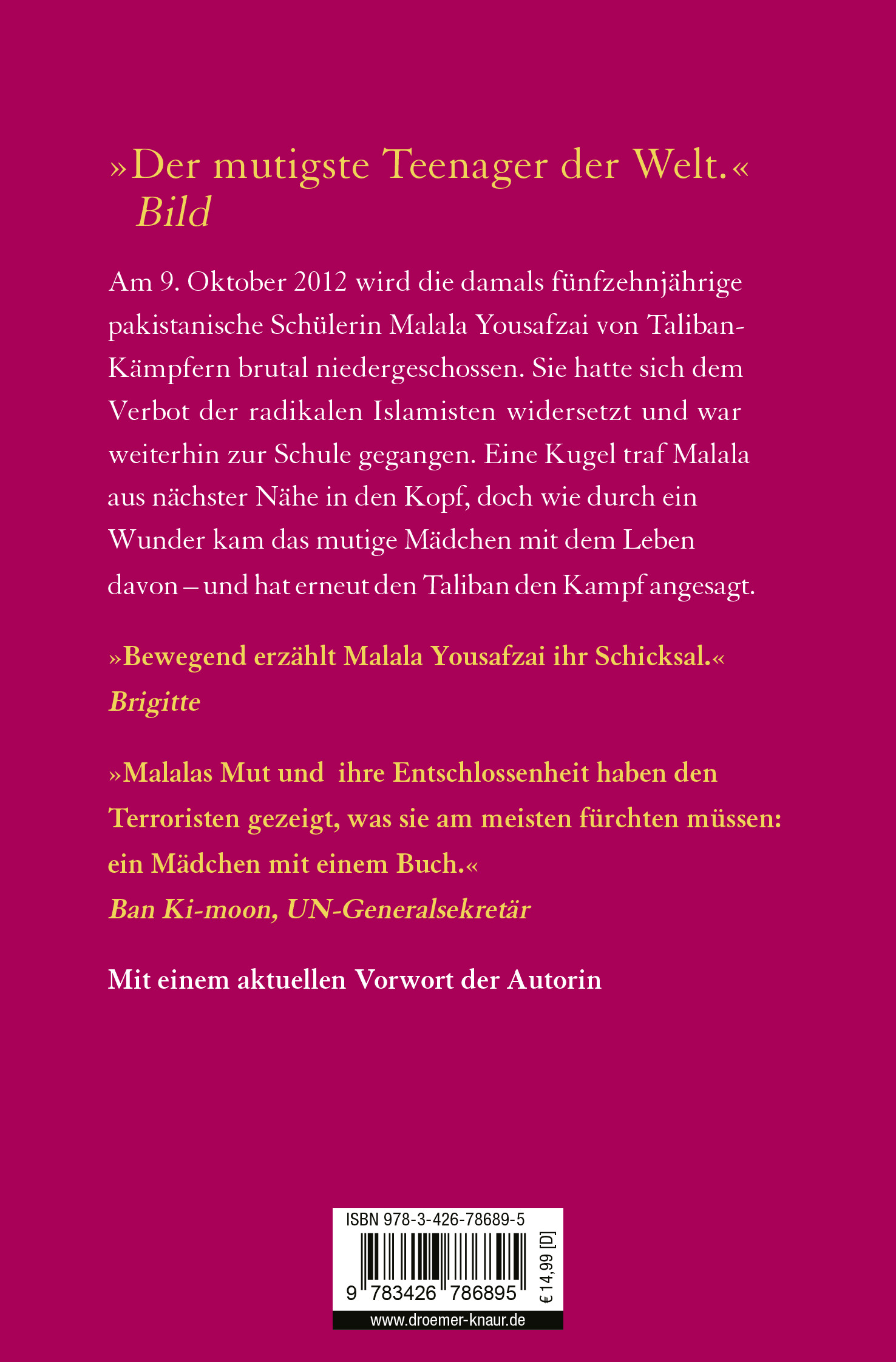 | Schlagworte | Attentat • Autobiografie • Autobiografien Frauen • Autobiographie • biografien berühmter frauen • Biografien Frauen • Erfahrungen und Schicksale • Erfahrungen und wahre Geschichten • Extremisten • Frauenrechte • Frauenschicksal • Frau im Islam; Biografien • Friedensnobelpreis • Großbritannien • Internationaler Friedenspreis für Kinder • Islam • Kinderrechte • Lebensgeschichten Frauen • Lebensgeschichten Schicksal Bücher • Mädchen • Memoir • Mordanschlag • Muslima; Biografien • Muslima / Muslimin / Moslemin; Biografien • Mut • mutiges Mädchen • Mutmachbuch • Mut machen • Pakistan • Pakistan; Biografien • pakistani • Recht auf Bildung • Scharia • Schicksale Bücher • Schicksale und Erfahrungen • Schulbesuch • Schule • Schülerin • Specsavers National Book Awards • Taliban • Taliban; Biografie • Terror • Terrorismus • Terroristen • Verfolgung • Vorbild • Yousafzai, Malala • Zivilcourage |