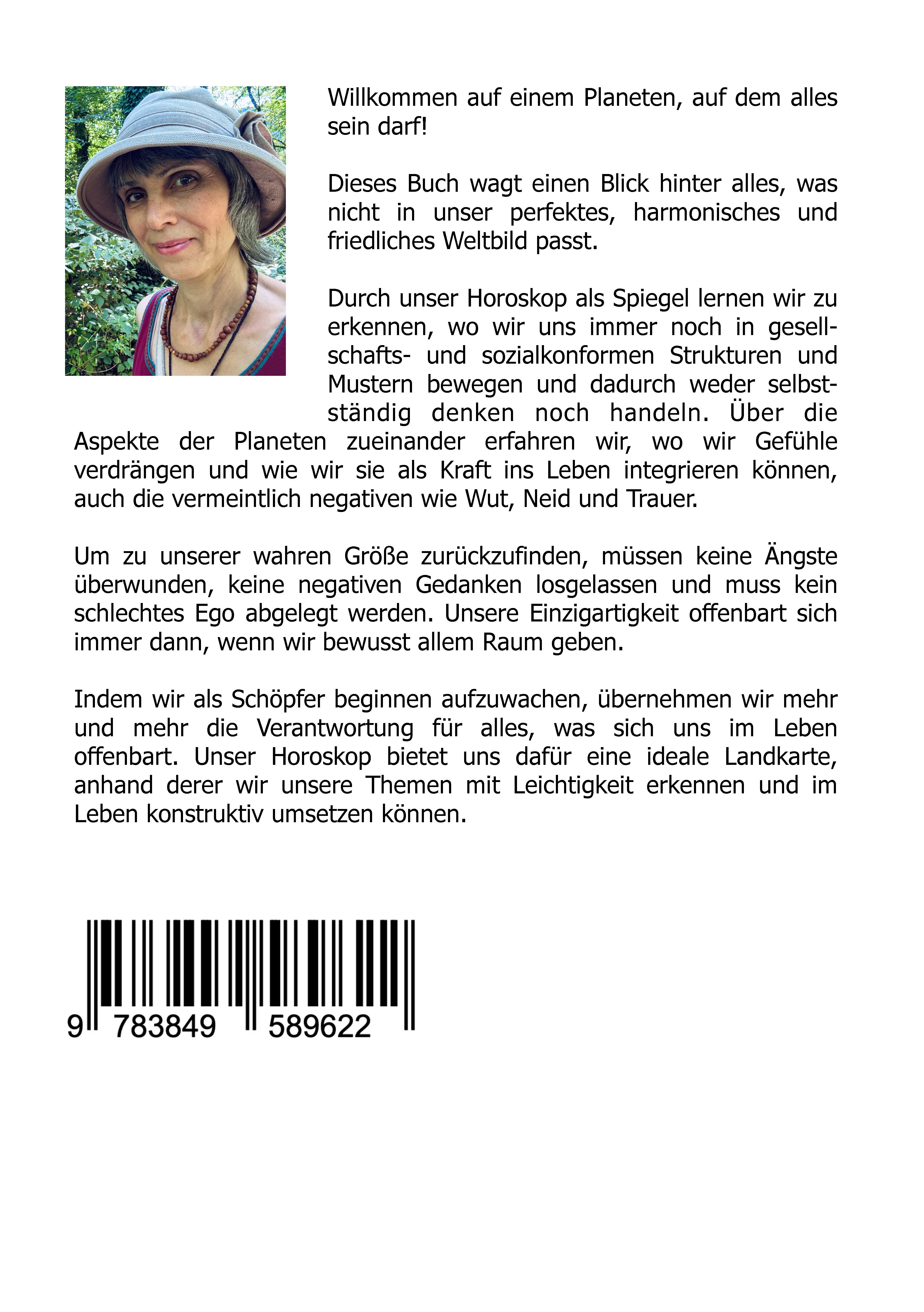Alles darf sein - denn wir sind schon vollkommen ! Mit diesem Buch wagt die Autorin einen Blick hinter alles, was nicht in unser perfektes, harmonisches und friedliches Weltbild passt. Durch unser Horoskop als Spiegel lernen wir zu erkennen, wo wir uns immer noch in kollektiven Strukturen und Mustern bewegen und dadurch weder selbständig denken noch handeln. Über die Aspekte der Planeten zueinander erfahren wir, wo wir Gefühle verdrängen und wie wir sie als Kraft ins Leben integrieren können, auch die vermeintlich negativen wie Wut, Neid und Trauer. Um zu unserer wahren Grösse zurück zu finden müssen keine Ängste überwunden, keine negativen Gedanken losgelassen und muss kein schlechtes Ego abgelegt werden. Unsere Einzigartigkeit und unsere Besonderheit offenbaren sich immer dann, wenn wir bewusst allem Raum geben. Indem wir als Schöpfer beginnen aufzuwachen, über-nehmen wir mehr und mehr die Verantwortung für alles, was sich uns im Aussen spiegelt, weil nur wir es erschaffen können. Unser Horoskop bietet uns dafür eine ideale Landkarte, mit der wir unsere Themen mit Leichtigkeit erkennen und im Leben konstruktiv umsetzen können.