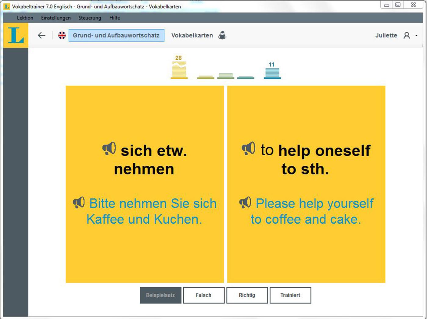 Der erfolgreiche Vokabeltrainer von Langenscheidt erscheint in der Version 7.0 in neuem Design und mit verbesserter Benutzerführung und trägt so noch stärker zu einem effektiven Wortschatztraining bei. In 12 unterschiedlichen Trainingsformen können Sie das systematische Üben mit dem bewährten Karteikastenprinzip und die regelmäßige Wiederholung des Wortschatzes ganz individuell auf Ihre Bedürfnisse anpassen.