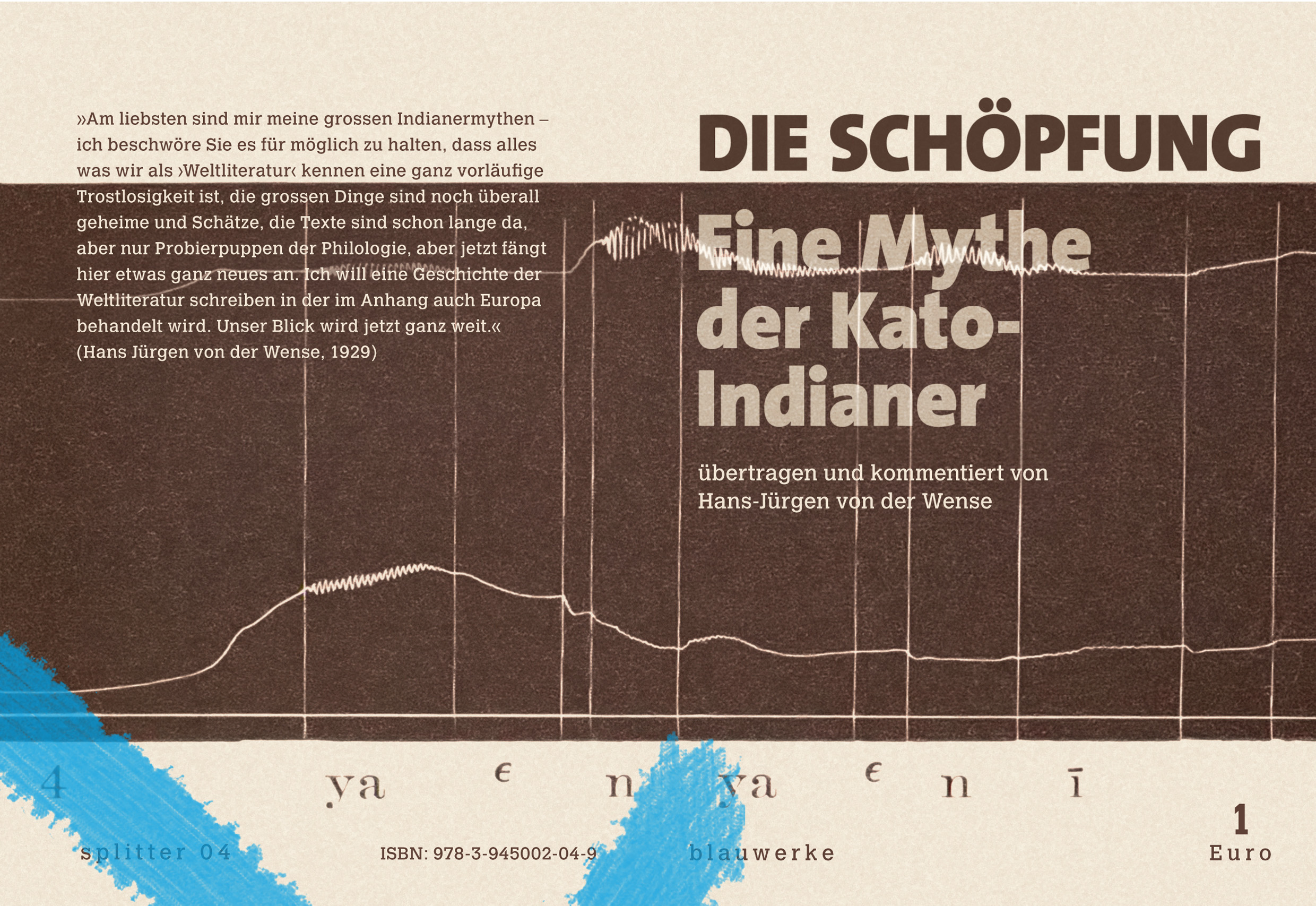 Hans Jürgen von der Wense (1894–1966): Der Fragmentariker, Komponist, Wanderer, Fotograf, Collagekünstler, Wetterkundler als Übersetzer: Die Neuübertragung zweier Schöpfungsmythen des Kato- (auch Cahto)-Indianerstammes Nordwest-Kaliforniens ist ein Splitter seines phantastischen Projekts, den kompletten Erdball in Übertragungen zu umkreisen und durch die vielfachen Variationen den einen Ursprung der Welt in ein delirantes Strudeln zu versetzen. Eine radikale Absage an jede eurozentrische Kultur- und Literaturgeschichtsschreibung und die ergreifende Begegnung mit einer anderen Heiligkeit.