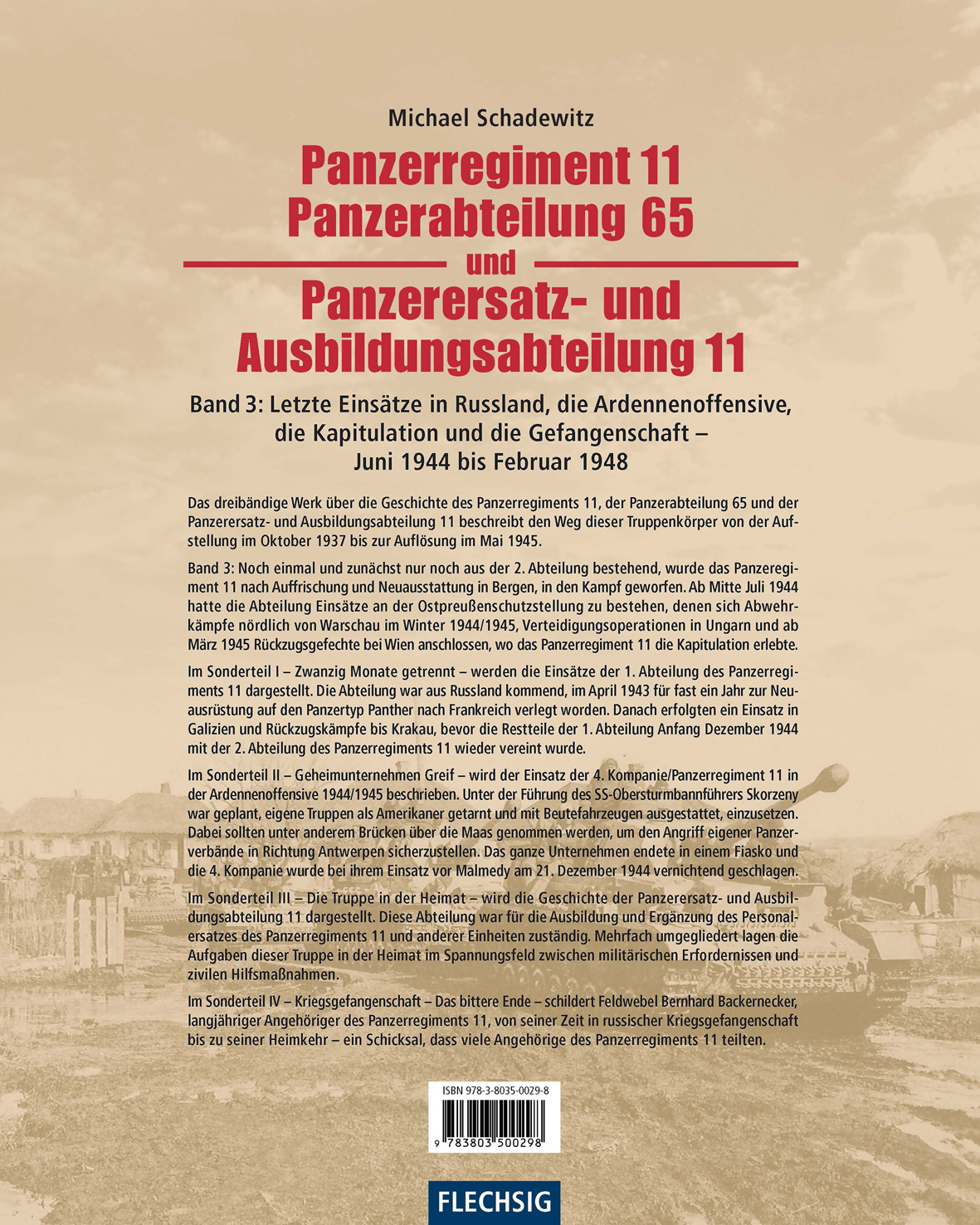 Im Sonderteil IV – Kriegsgefangenschaft – Das bittere Ende – schildert Feldwebel Bernhard Backernecker, langjähriger Angehöriger des Panzerregiments 11, von seiner Zeit in russischer Kriegsgefangenschaft bis zu seiner Heimkehr – ein Schicksal, dass viele Angehörige des Panzerregiments 11 teilten.