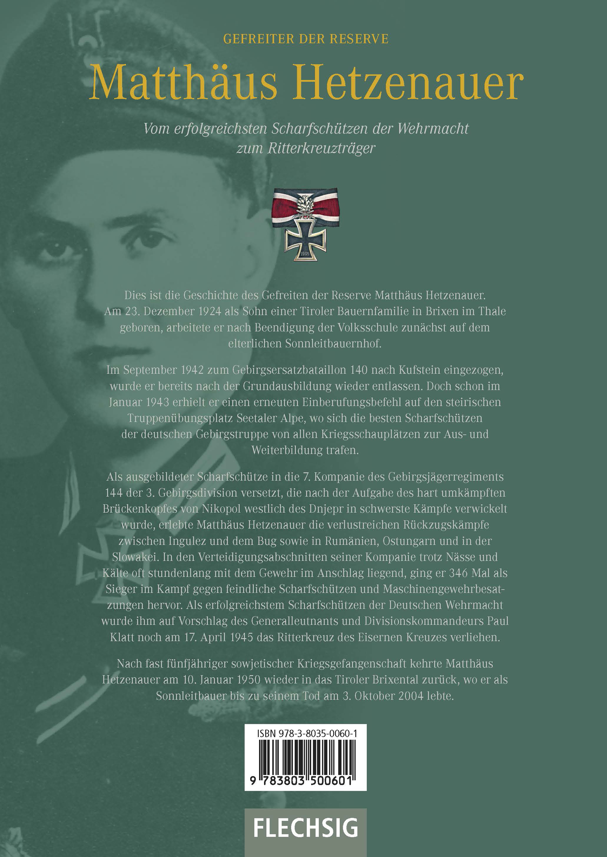 | Schlagworte | 2. Weltkrieg; Biografien • 2. Weltkrieg / Zweiter Weltkrieg; Biografien • 3. Gebirgsdivision • Armee • Biografie • Brixen • Brückenkopf • Bug • Dnjepr • Gebirgsarmeekorps • Gebirgsersatzbataillon • Gebirgsjäger • Gebirgstruppe • Gefreiter • Hetzenauer, Matthäus • Ingulez • Kriegsgefangenschaft • Kufstein • Matthäus Hetzenauer • Nikopol • Ostungarn • Paul Klatt • Reserve • Ritterkreuz (Orden) • Ritterkreuzträger • Rumänien • Russland • Scharfschütze • Scharfschütze der Wehrmacht • Scharfschützen • Seetaler Alpe • Slowakei • Sniper • Sonnleitbauernhof • Tirol • Wehrmacht • Zweiter Weltkrieg |
