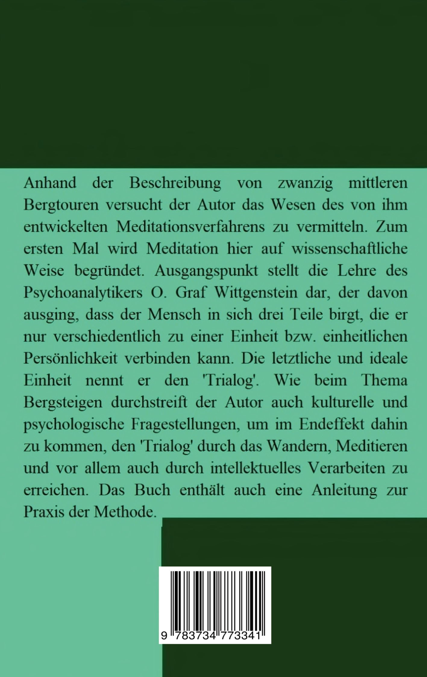 Anhand der Beschreibung von einundzwanzig mittleren Bergtouren versucht der Autor das Wesen des von ihm entwickelten Meditationsverfahrens zu vermitteln. Zum ersten Mal wird Meditation hier auf wissenschaftliche Weise begründet. Ausgangspunkt stellt die Lehre des Psychoanalytikers O. Graf Wittgenstein dar, der davon ausging, dass der Mensch in sich drei Teile birgt, die er nur verschiedentlich zu einer Einheit bzw. einheitlichen Persönlichkeit verbinden kann. Die letztliche und ideale Einheit nennt er den 'Trialog'. Wie beim Bergsteigen durchstreift der Autor alle möglichen kulturellen und psychologischen Fragestellungen, um im Endeffekt dahin zu kommen, den 'Trialog' durch das Wandern, Meditieren und intellektuelle Verarbeiten zu erreichen. Das Buch enthält auch eine Anleitung zur Praxis der Methode.