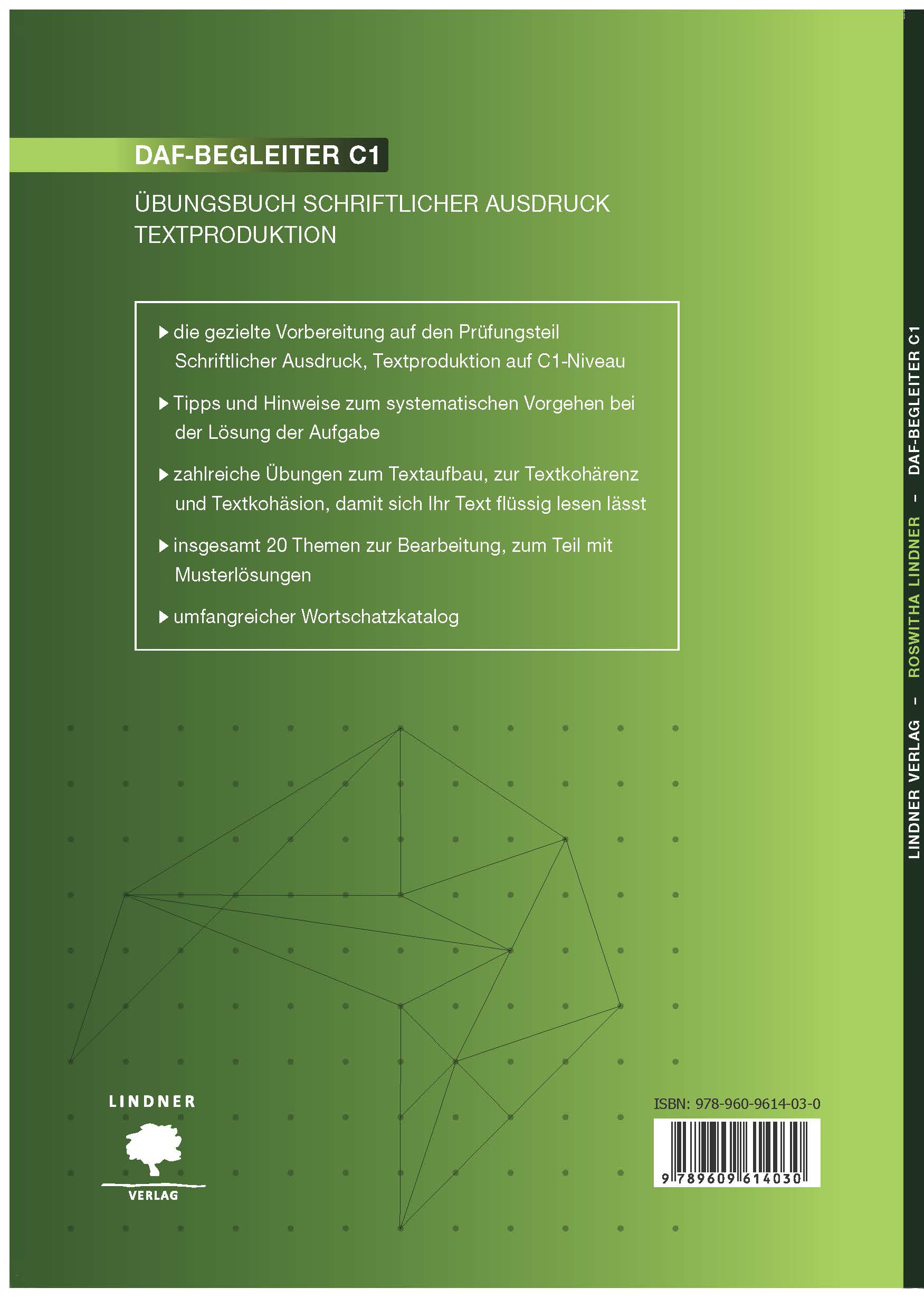 Lernen kommt vor dem Testen! Der DaF-Begleiter C1 (Schriftlicher Ausdruck und Textproduktion) trainiert als einziges Lehrwerk mit dem Lerner systematisch Aufbau und Verfassen eines Aufsatzes auf dem Niveau C1 (Goethe C1, TestDaF, DSH). Praktische Beispiele und Übungen, ergänzt durch detaillierte Übersichten mit Redemitteln, Wortschatz und zu grammatischen Phänomenen sowie einer repräsentativen Auswahl an bearbeiteten Themen versetzen jeden Lerner dazu in die Lage, überzeugende Aufsätze auf dem Sprachniveau C1 auszuarbeiten. Dem Übungsteil mit Musterlösungen schließen sich weitere Modellaufgaben im Testformat sowie eine ausführliche thematisch geordnete Wortschatzübersicht an.