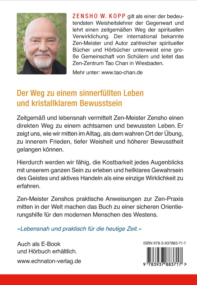 Der Weg zu kristallklarem Bewusstsein und aktivem LebenWir leben in einer Zeit, in der immer mehr Menschen bestrebt sind, spirituelles und aktives Leben zu verbinden. Aus diesem Grund erhält ein Buch wie dieses seinen ganz besonderen Wert, denn es kann unser ganzes Leben verändern. Zen-Meister Zenshos praktische Anweisungen zur Zen-Praxis im täglichem Leben machen das Buch zu einer sicheren Orientierungshilfe für den modernen Menschen des Westens. Leicht verständlich veranschaulicht Zensho, worum es in dieser Zen-Praxis geht und wie sie uns zu innerem Frieden, tiefer Weisheit und einem sinnerfüllten Leben führt. Zeitgemäß und absolut lebensnah vermittelt er uns einen direkten Weg zu einem achtsamen, bewussten Leben. Er zeigt uns, wie wir mitten im Alltag als dem wahren Ort der Übung geistige Klarheit und Glück in uns selbst verwirklichen können. Hierdurch werden wir fähig, die Kostbarkeit jedes Augenblicks mit unserem ganzen Sein zu erleben und kristallklares Bewusstsein und aktives Handeln als eine einzige Wirklichkeit zu erfahren.