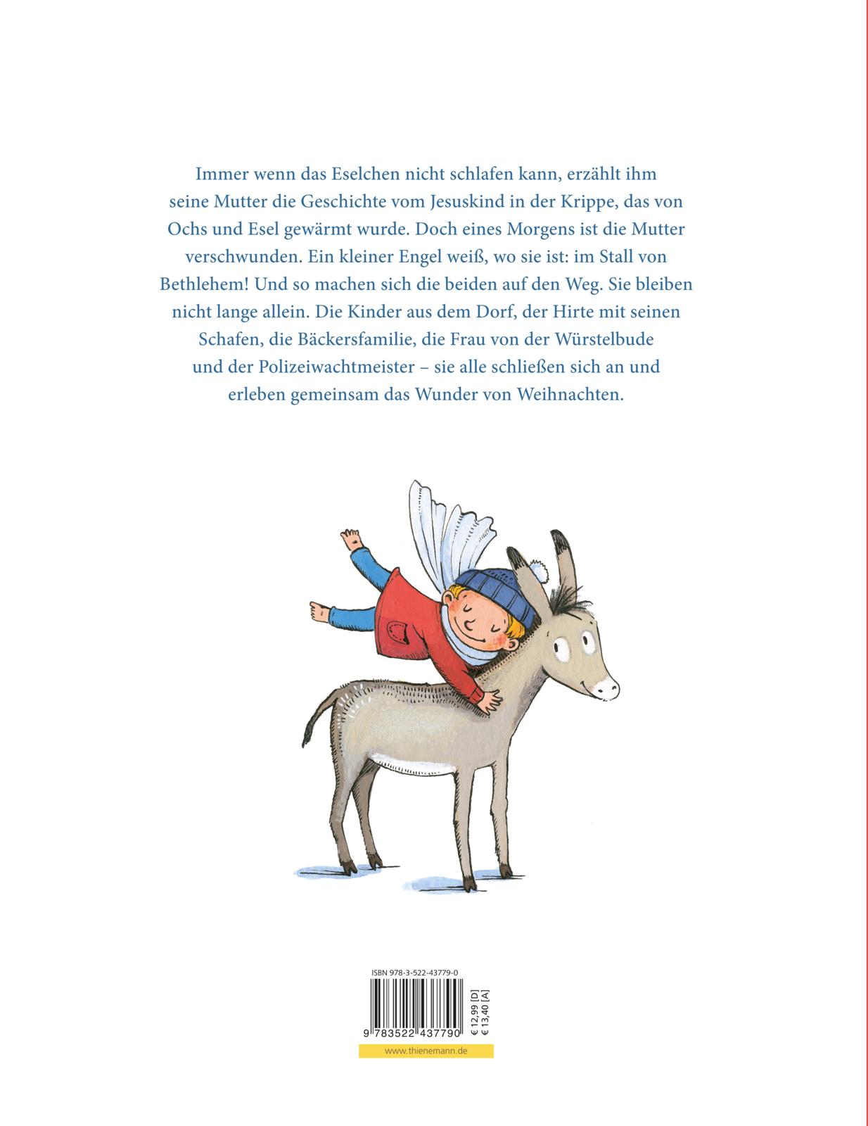 Es war einmal ein kleiner Esel, der war erst kürzlich zur Welt gekommen. Im Winter wärmte ihn seine Mutter mit ihrem Atem. Manchmal erzählte sie ihm zum Einschlafen die Geschichte von jener Eselin, die im Stall von Bethlehem das Jesuskind mit seinem Atem wärmte. Als das Eselchen eines Morgens aufwacht, ist seine Mutter verschwunden! Ein kleiner Engel aber weiß, wo die die Mutter ist: Beim Jesuskind, an der Krippe im Stall. Gemeinsam machen sie sich auf den Weg und erleben das Wunder der Weihnacht.