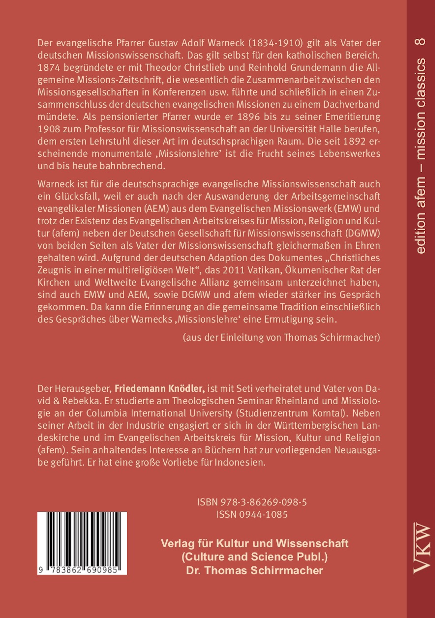 | Schlagworte | Allgemeine Missions-Zeitschrift • Arbeitsgemeinschaft evangelikaler Missionen (AEM) • Emeritierung • Evange • Evangelisch • Evangelisches Missionswerk (EMW) • Gustav Warneck • Missionsgesellschaften • Missionslehre • Missionstheologie • Missionswissenschaft • Pfarrer • Praktische • Professor • Religion • Theologie • Warneck, Gustav • Weltmission |