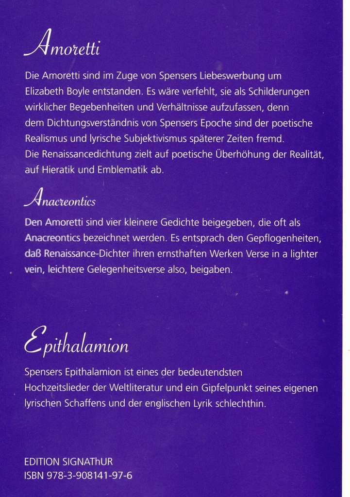 Erstmals hat es Thomas Eichhorn übernommen, Spensers AMORETTI mit den ANACREONTICS und dem EPITHALAMION, dem berühmtesten Hochzeitslied der englischen Literatur, ins Deutsche zu übertragen und in einem Band zu vereinigen.