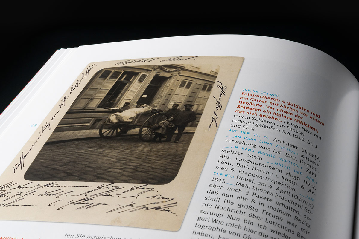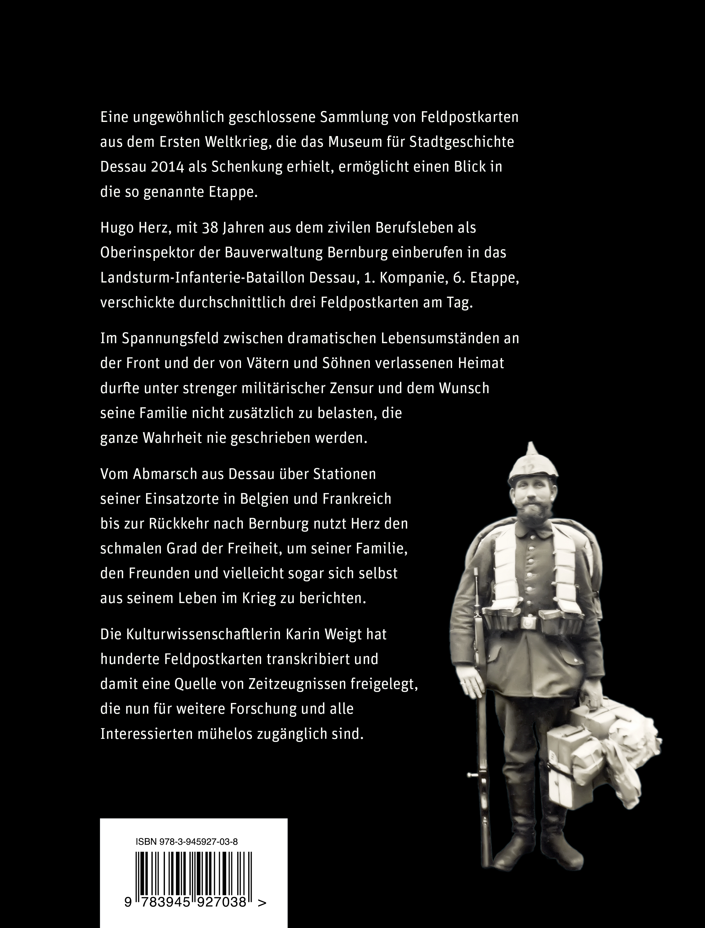 Der Beginn des Ersten Weltkrieges vor hundert Jahren war im Jahr 2014 impulsgebend für eine Fülle von internationalen Ausstellungen, Lesungen, Fernsehdokumentationen und vielen weiteren Publikationen. Auch in Dessau-Roßlau gab es aus diesem Anlass zu dem bis dahin meist durch den Zweiten Weltkrieg verdrängten Thema bereits verschiedene Vorträge und Veranstaltungen. Gemeinsam mit Partnern des Museumsverbandes Sachsen-Anhalt entwickelte das Museum für Stadtgeschichte Dessau die Idee, analog zur Dauer des Krieges von 1914–1918 eine auf vier Jahre angelegte Ausstellung zu konzipieren. Diese soll dem schon bekannteren Kriegsgeschehen an der Front die Ereignisse und Veränderungen des Kriegsalltags im lokalen und regionalen Bereich gegenüber stellen. So zeigt die Wanderausstellung mit dem Titel »Heimat im Krieg 1914/1918. Spurensuche in Sachsen-Anhalt« an jedem ihrer Standorte neben den überregionalen Aspekten die Ergebnisse der neuesten Recherchen über die lokalen Veränderungen des Alltags in der Heimat. In Dessau wird die Schau als 8. Station im Herbst 2015 präsentiert. Im Zusammenhang mit den Recherchen zu dieser Ausstellung erhielt das Museum für Stadtgeschichte im Frühjahr 2014 eine Schenkung von einem Dessauer Einwohner mit rund 300 Schriftstücken und einigen kleineren Objekten aus dem Ersten Weltkrieg. Die meisten davon sind Feldpostkarten eines anhaltischen Bürgers, der im Landsturm-Infanterie-Bataillon Dessau diente. Außerdem umfasst die Schenkung biografische Dokumente zu seinem beruflichen Werdegang und persönliche Auszeichnungen sowie einen sogenannten »Kriegsdolmetscher« (ein französisch-deutsches Wörterbuch, das speziell auf Kriegsvokabular zugeschnitten ist), unbeschriftete, nicht verschickte Karten und etliche Erinnerungsstücke an den Krieg wie Knöpfe oder auch Schulterklappen von Uniformen u. ä., die er während des Krieges gesammelt hat. Mit der vorliegenden Publikation wird das dokumentarisch interessante Material nun für eine breite Öffentlichkeit zugänglich gemacht. Im Vordergrund stehen hierbei nicht die großen militärstrategischen Vorgänge des Ersten Weltkrieges mit ihren grausamen Auswirkungen, sondern die subjektiven Erlebnisse einer einzelnen Person, des Soldaten Hugo Herz, der in diesem dramatischen Umfeld versucht, das beste aus der Situation für seine Familie, Freunde, Kameraden und sich selbst zu machen. Er wurde an Orten hinter der Front in der sogenannten Etappe eingesetzt und berichtet in relativ dichter zeitlicher Abfolge an die Familie über seine Erlebnisse. Der Fokus auf die Ausführungen einer einzelnen Person unterscheidet diese Publikation von der in 2014 im Stadtarchiv Dessau-Roßlau herausgegebenen Veröffentlichung »Da kam ein Brief von fremder Hand … Schicksale von Soldaten aus Dessau und Roßlau im Ersten Weltkrieg«. Dort werden Ausschnitte aus Feldpostbriefen sehr vieler verschiedener Soldaten, die meist direkt an der Front eingesetzt waren, dokumentiert. Die persönlichen Schilderungen von Hugo Herz wecken gleichermaßen Interesse für das Beschriebene, lösen aber auch Erstaunen über das auffallend selten oder gar nicht Dargestellte aus. Das brutale Geschehen an der nahen Front, grausame Kriegsverletzungen, Giftgaseinsätze, das Elend in den Schützengräben und das Massensterben sind weitestgehend ausgeblendet. Viele damals vorhandene mögliche Gründe wie Zensur, militärische Geheimhaltung und der Druck, nicht als Verräter an der Kampfmoral denunziert zu werden, spielen dabei – wie in jedem Krieg – mit Sicherheit eine wichtige Rolle. Doch die Intensität und Häufigkeit seiner schriftlichen Kontakte und das Ausblenden besorgniserregender Dinge sind wohl auch ein Indiz für eine andere wichtige Funktion: Die mentale Stärkung der verlassenen Familie, die nicht zusätzlich belastet werden soll, aber auch die eigene mentale Stabilisierung als Überlebensstrategie in einem Umfeld von Bedrohung und Ohnmacht. In den Kriegsjahren zwischen 1914 und 1918 wurden von der deutschen Feldpost ca. 28,7 Milliarden Sendungen zwischen der Front und der Heimat verschickt. Feldpost stellte oft die einzige Verbindung zwischen den Daheimgebliebenen und den Soldaten her. Sie ermöglicht einerseits Einblicke in das persönliche Erleben und Leiden an und hinter der Front und lenkt gleichzeitig den Blick auf die Adressaten in der Heimat, die zurückgebliebenen Verwandten, Freunde oder Kollegen. Die ungeheuere Anzahl vor allem der Feldpostkarten als Massenware aus dem Ersten Weltkrieg weist auf eine wichtige kommunikative und emotionale Funktion dieses Mediums hin, die den Vergleich mit heutigen Kommunikationsmedien wie SMS nahelegt. Erst eine umfassende Aufarbeitung der zahlreichen und zum Teil erst in den letzten Jahren aufgetauchten Quellen unter den unterschiedlichsten Fragestellungen wird zu einem vollständigeren Bild über die Auswirkungen des Krieges nicht nur an der Front, sondern insbesondere in der Region führen können. Die Tatsache, dass viele Menschen selbst gar nicht mehr in der Lage sind, die altdeutsche Schrift (meist Sütterlin und Kurrentschriften) zu entziffern und sich mit dem schriftlichen Nachlass ihrer Familien nur in transkribierter Form auseinander setzen können, ist wohl auch ein Grund dafür, dass viele Karten und Briefe 2014 zum aktuellen Anlass aus privater Hand in Museen und Archive übergeben wurden.