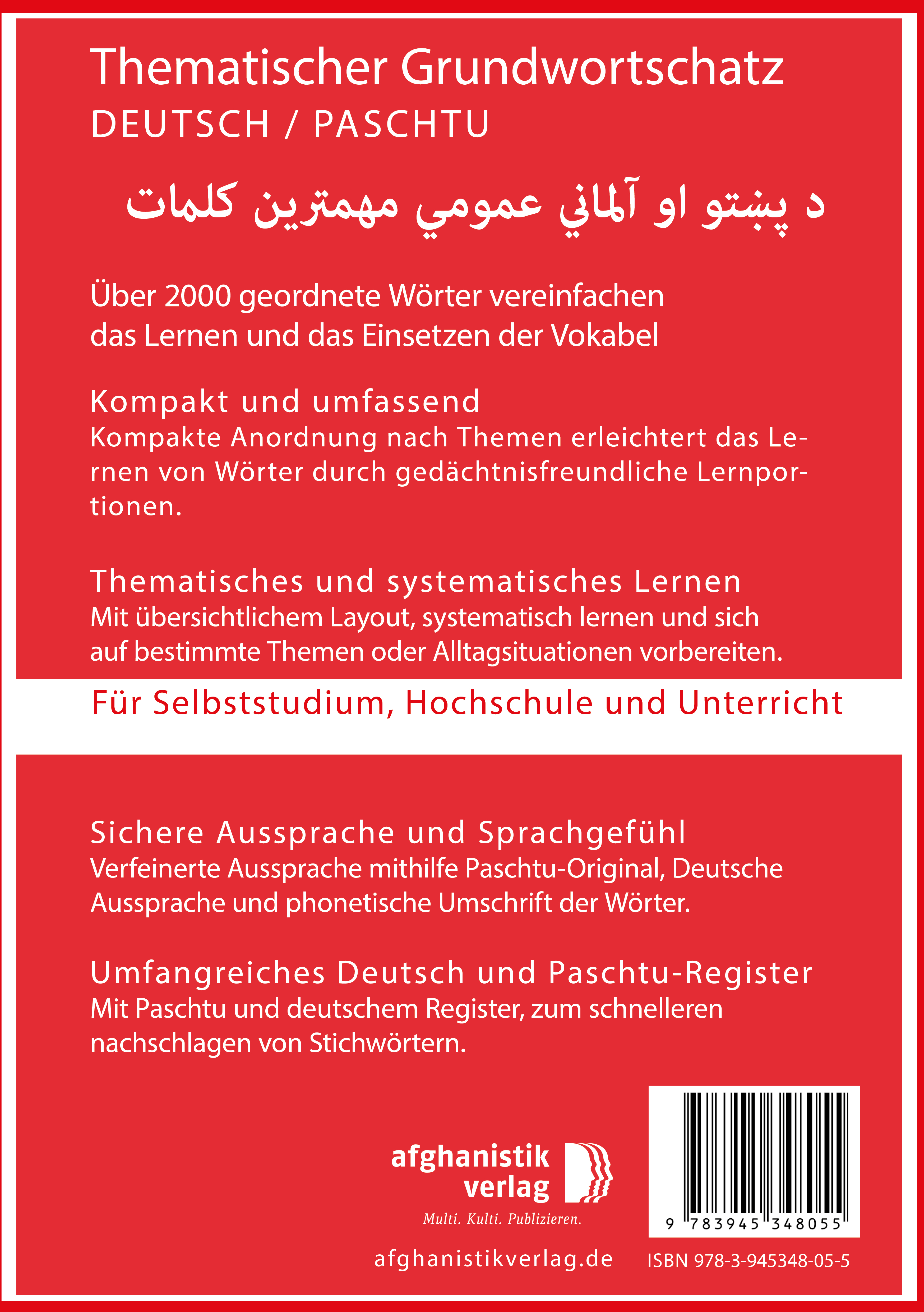 Über 2000 geordnete Wörter vereinfachen das Lernen und das Einsetzen der VokabelKompakt und umfassend:Kompakte Anordnung nach Themen erleichtert das Lernen der Wörter. Zusätzlich unterstützt durch gedächtnisfreundliche Lernportionen.Thematisches und systematisches Lernen:Mit übersichtlichem Layout, systematisch lernen und sichauf bestimmte Themen oder Alltagsituationen vorbereiten.Sichere, verfeinerte Aussprache und Sprachgefühl:Mithilfe einer Transkription der deutschen Vokabeln auf Patschu und phonetische Umschriften der Wörter.Umfangreiches Deutsch - Paschtu Register und Paschtu -Deutschem Register, zum schnelleren Nachschlagen von Stichwörtern.Die beste Grundlage zum Vokabellernen. Besonders geeignet für das Selbststudium, die Hochschule und den Unterricht.Ideal für Reise, Beruf oder zu Hause.