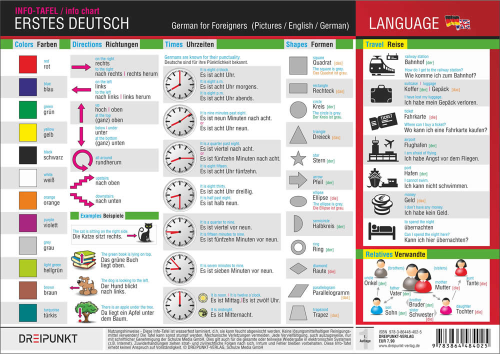Mit dieser Info-Tafel können Menschen jeden Alters, ob mit oder ohne Vorkenntnisse, die wichtigsten Grundlagen der deutschen Sprache erlernen. Viele Bilder, Piktogramme und -für viele wichtig- englische Übersetzungen fördern die Kommunikation und stellen deutsche Begriffe und kurze Sätze einprägsam dar.