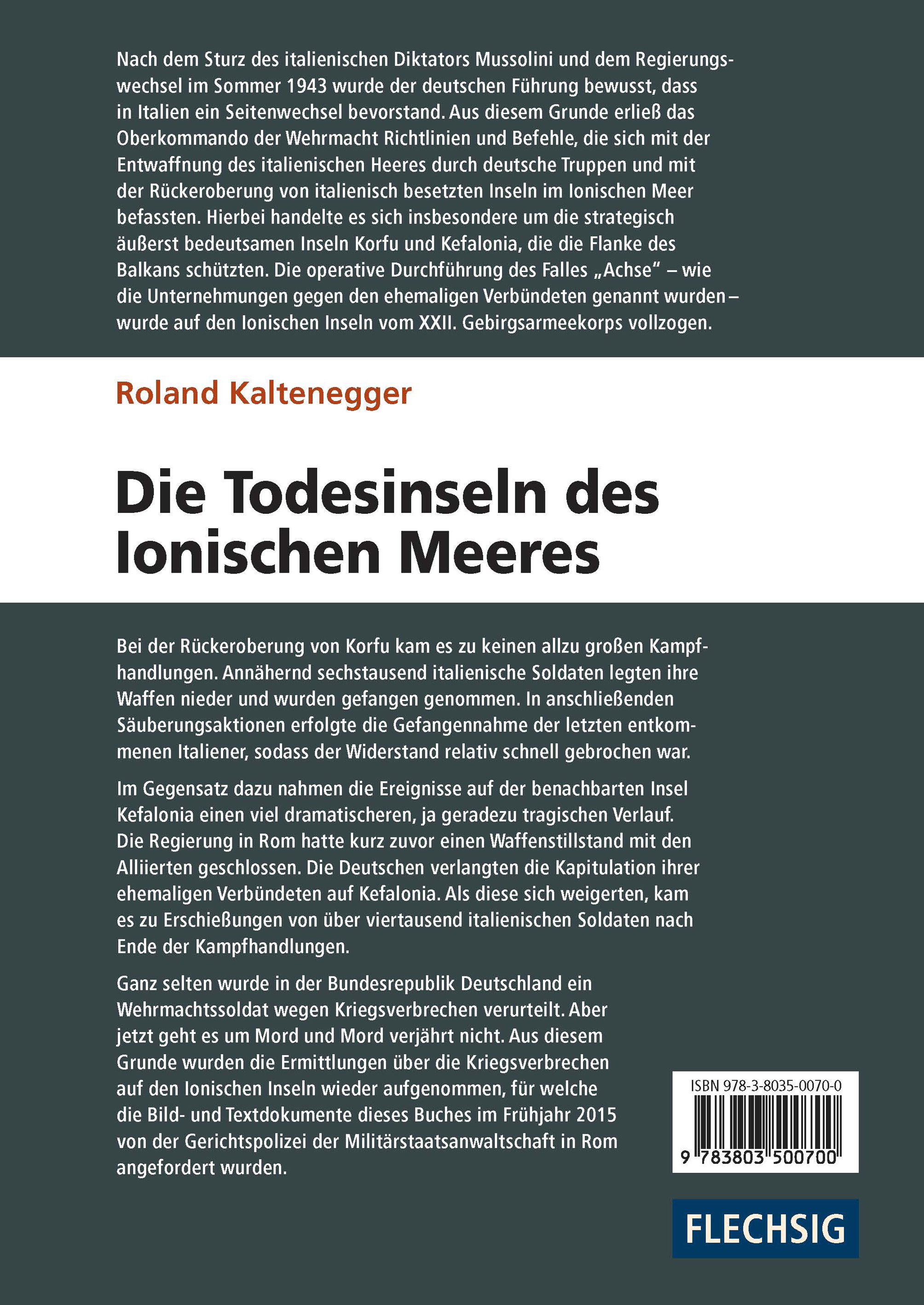Nach dem Sturz des italienischen Diktators Mussolini und dem Regierungswechsel im Sommer 1943 wurde der deutschen Führung bewusst, dass in Italien ein Seitenwechsel bevorstand. Aus diesem Grunde erließ das Oberkommando der Wehrmacht Richtlinien und Befehle, die sich mit der Entwaffnung des italienischen Heeres durch deutsche Truppen und mit der Rückeroberung von italienisch besetzten Inseln im Ionischen Meer befassten. Hierbei handelte es sich insbesondere um die strategisch äußerst bedeutsamen Inseln Korfu und Kefalonia, die die Flanke des Balkans schützten. Die operative Durchführung des Falles "Achse" - wie die Unternehmungen gegen den ehemaligen Verbündeten genannt wurden - wurde auf den Ionischen Inseln vom XXII. Gebirgsarmeekorps vollzogen.Bei der Rückeroberung von Korfu kam es zu keinen allzu großen Kampfhandlungen. Annähernd sechstausend italienische Soldaten legten ihre Waffen nieder und wurden gefangen genommen. In anschließenden Säuberungsaktionen erfolgte die Gefangennahme der letzten entkommenen Italiener, sodass der Widerstand relativ schnell gebrochen war.Im Gegensatz dazu nahmen die Ereignisse auf der benachbarten Insel Kefalonia einen viel dramatischeren, ja geradezu tragischen Verlauf. Die Regierung in Rom hatte kurz zuvor einen Waffenstillstand mit den Alliierten geschlossen. Die Deutschen verlangten die Kapitulation ihrer ehemaligen Verbündeten auf Kefalonia. Als diese sich weigerten, kam es zu Erschießungen von über viertausend italienischen Soldaten nach Ende der Kampfhandlungen.Ganz selten wurde in der Bundesrepublik Deutschland ein Wehrmachtssoldat wegen Kriegsverbrechen verurteilt. Aber jetzt geht es um Mord und Mord verjährt nicht. Aus diesem Grunde wurden die Ermittlungen über die Kriegsverbrechen auf den Ionischen Inseln wieder aufgenommen, für welche die Bild- und Textdokumente dieses Buches im Frühjahr 2015 von der Gerichtspolizei der Militärstaatsanwaltschaft in Rom angefordert wurden.