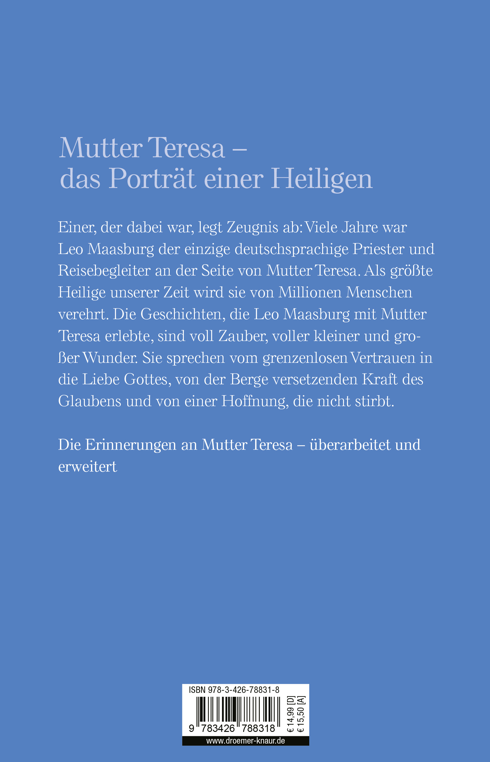 Leo Maasburg, 1948 in Graz geboren, studierte Rechts- und Politikwissenschaften, Theologie und Missiologie in Innsbruck, Oxford und Rom. 1982 wurde er in Fatima zum Priester geweiht und arbeitete in Rom für den slowakischen Exilbischof Pavol Hnilica. Hier, im Schatten des Vatikans, wurde er von Mutter Teresa „entdeckt“. Viele Jahre begleitete er den „Engel der Armen“ in Indien, in Rom und auf zahllosen Reisen zwischen Moskau und New York. Er stand Mutter Teresa als Priester und geistlicher Begleiter zur Verfügung, aber auch als ihr Sondergesandter für so manche heikle Mission in der kommunistischen Sowjetunion oder im Kuba Fidel Castros. Nach ihrem Tod gehörte Leo Maasburg zu jenem Team, das Mutter Teresas Seligsprechung vorbereitete. Seit 2005 ist er Nationaldirektor der „Päpstlichen Missionswerke in Österreich“ (www.missio.at).
