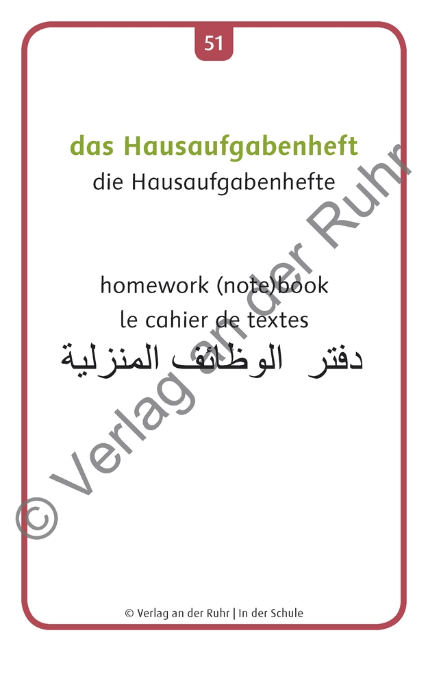 Bildkarten für Lehrer und Sprachförderkräfte in der Kita, an Schulen sowie für außerschulische Lehrkräfte, Fach: Sprachförderung, Deutsch als Zweitsprache/Fremdsprache. Für alle Altersstufen; Sprachniveau A1 +++ Herzlich Willkommen! - Welcome! - Bienvenue! - Ahlaan wa sahlaan! Viele Menschen, die z. B. als Flüchtlinge nach Deutschland kommen, sind noch nie mit der deutschen Sprache in Berührung gekommen. Diese Migranten wollen die deutsche Sprache nun in der Regel so schnell wie möglich lernen. Egal ob Kinder oder Erwachsene, ob in Kita oder Schule, im VHS-Kurs, der Flüchtlingshilfe oder zu Hause: Mit diesen flexibel einsetzbaren Bildkarten können Sie Deutschlernern einfach und effektiv helfen. Jedes Set beinhaltet 60 Karten zu den wichtigsten Alltagsbereichen, in denen Sprachkenntnisse besonders nötig sind. Auf der Vorderseite ist jeweils ein Bild von einem Gegenstand dargestellt, auf der Rückseite steht der deutsche Begriff im Singular und Plural mit Artikel. Die Genera sind unterschiedlich farblich markiert. Zusätzlich wird der Begriff in weiteren Sprachen benannt (Englisch, Französisch und Arabisch). Dadurch ergeben sich vielfältige Einsatzmöglichkeiten zum Sprechen und Zuhören. Kurze Anwendungstipps runden das Set ab. Ausführliche Ideen zu Übungen, Spielen u.v.m. finden Sie im zusätzlichen Download. Fotokartenset zu folgendem Thema: - In der Schule