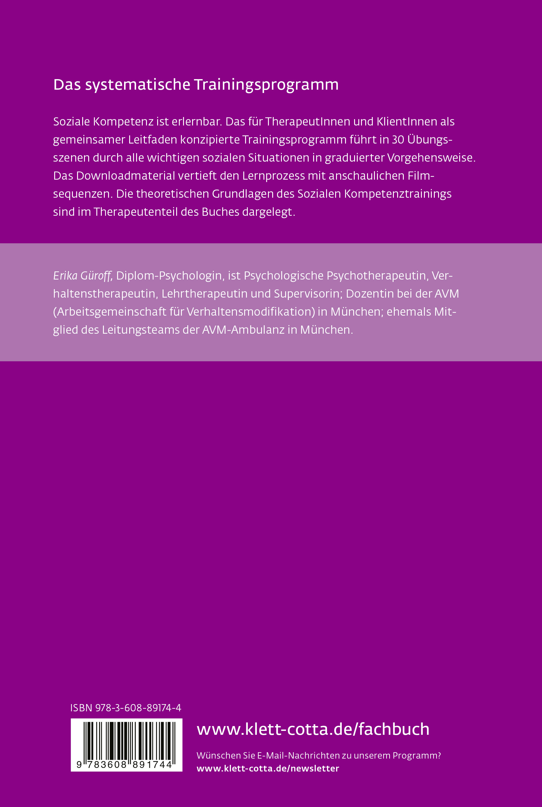 Das Training sozialer Kompetenzen gehört zum Kernbereich des verhaltenstherapeutischen Repertoires. Viele psychische Störungen bessern sich, wenn an Selbstwertproblemen und sozialen Ängsten aktiv gearbeitet wird. Bewusst sucht der Klient angstbesetzte zwischenmenschliche Situationen auf, die er Schritt für Schritt einübt. Das Therapiemanual dient TherapeutInnen und KlientInnen als gemeinsamer Leitfaden für ein systematisches, aufeinander aufbauendes Vorgehen, dessen positive therapeutische Effekte wissenschaftlich erwiesen sind. Das Training kann im Rahmen einer durch die Krankenkasse genehmigten Langzeittherapie passgenau durchgeführt werden.