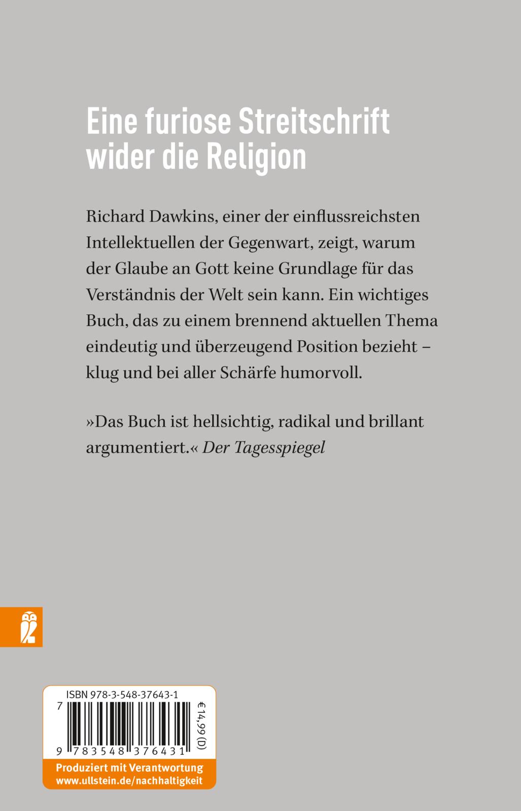 »Religion ist irrational, fortschrittsfeindlich und zerstörerisch.« Richard Dawkins, einer der einflussreichsten Intellektuellen der Gegenwart, zeigt, warum der Glaube an Gott einer vernünftigen Betrachtung nicht standhalten kann. Ein wichtiges Buch, das zu einem brennend aktuellen Thema eindeutig und überzeugend Position bezieht - brillant und bei aller Schärfe humorvoll.
