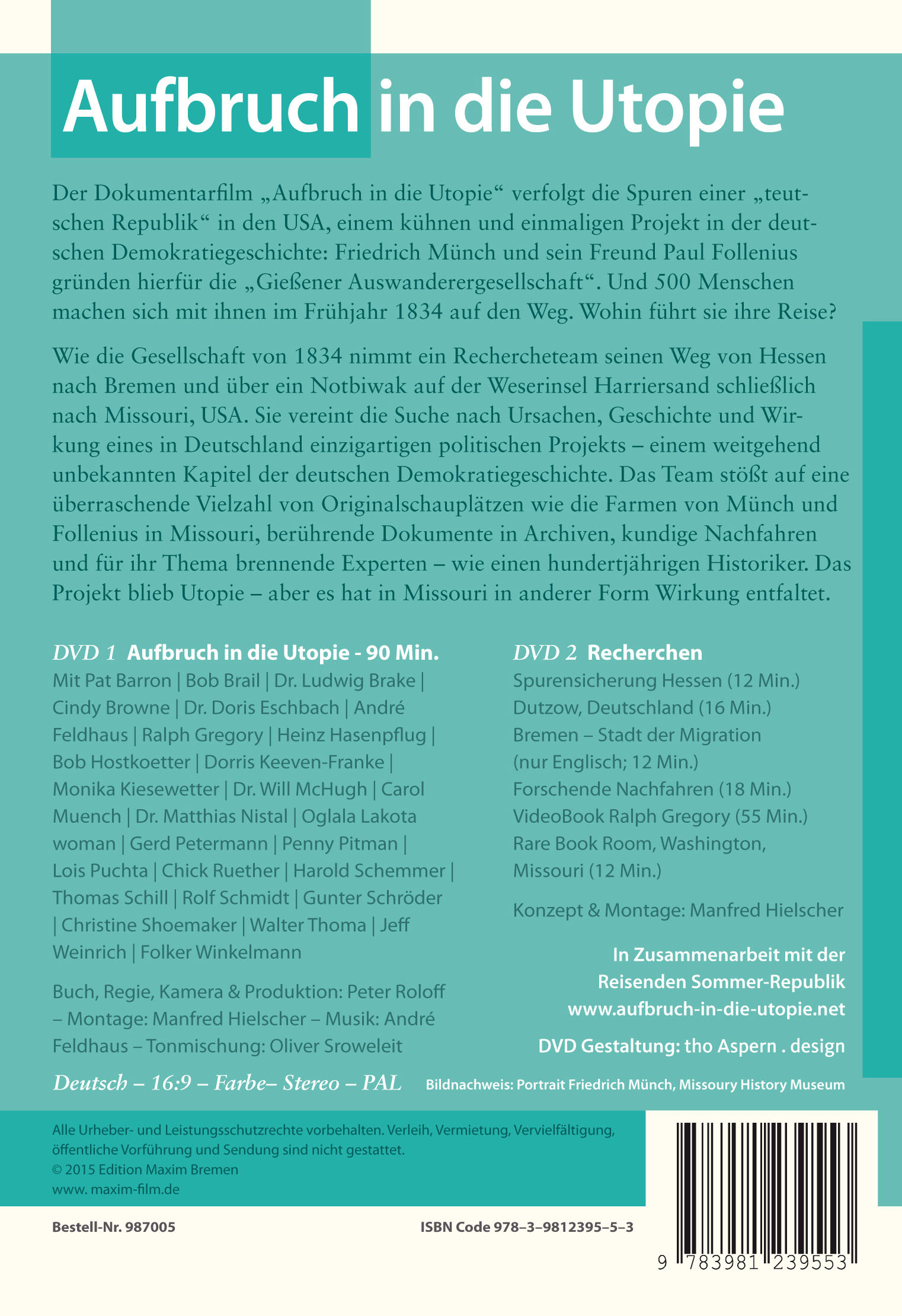 Der Dokumentarfilm "Aufbruch in die Utopie" verfolgt die Spuren einer "deutschen Republik" in den USA, einem kühnen und einmaligen Projekt in der deutschen Demokratiegeschichte: Friedrich Münch und sein Freund Paul Follenius gründen hierfür die "Gießener Auswanderergesellschaft". Und 500 Menschen machen sich mit ihnen im Frühjahr 1834 auf den Weg. Wohin führt sie ihre Reise? Wie die Gesellschaft von 1834 nimmt ein Rechercheteam seinen Weg von Hessen nach Bremen und über ein Notbiwak auf der Weserinsel Harriersand schließlich nach Missouri, USA. Sie vereint die Suche nach Ursachen, Geschichte und Wirkung eines in Deutschland einzigartigen politischen Projekts - einem weitgehend unbekannten Kapitel der deutschen Demokratiegeschichte. Das Team stößt auf eine überraschende Vielzahl von Originalschauplätzen wie die Farmen von Münch und Follenius in Missouri, berührende Dokumente in Archiven, kundige Nachfahren und für ihr Thema brennende Experten - wie einen hundertjährigen Historiker. Das Projekt blieb Utopie - aber es hat in Missouri in anderer Form Wirkung entfaltet.