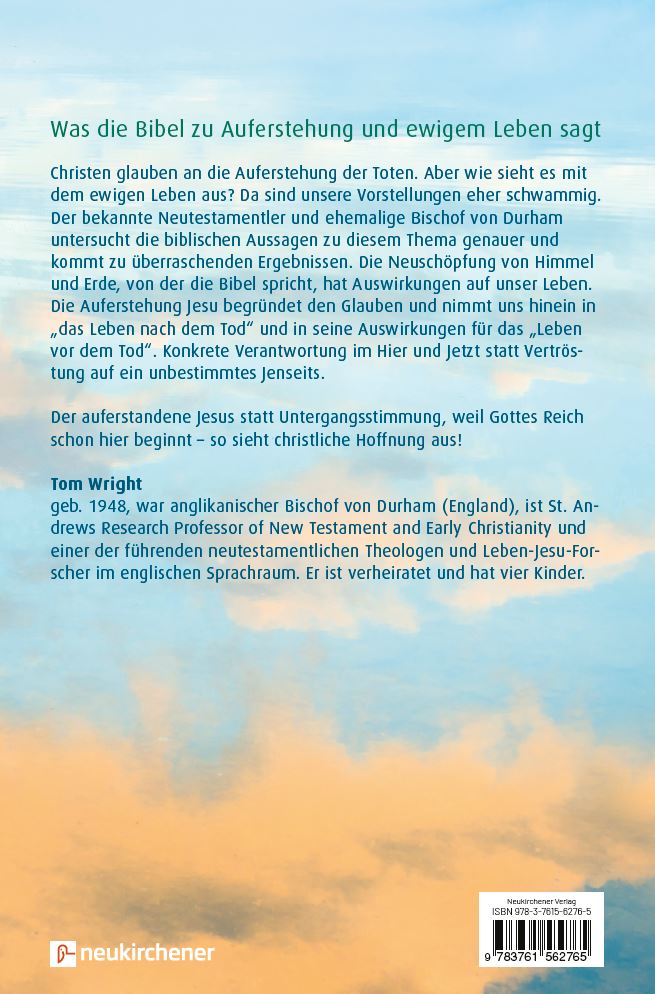 Christen glauben an die Auferstehung der Toten. Aber wie sieht es mit dem ewigen Leben aus? Da sind unsere Vorstellungen eher schwammig. Der bekannte Neutestamentler und ehemalige Bischof von Durham untersucht die biblischen Aussagen zu diesem Thema genauer und kommt zu überraschenden Ergebnissen. Die Neuschöpfung von Himmel und Erde, von der die Bibel spricht, hat Auswirkungen auf unser Leben. Die Auferstehung Jesu begründet den Glauben und nimmt uns hinein in "das Leben nach dem Tod" und in seine Auswirkungen für das "Leben vor dem Tod". Konkrete Verantwortung im Hier und Jetzt statt Vertröstung auf ein unbestimmtes Jenseits. Der auferstandene Jesus statt Untergangsstimmung, weil Gottes Reich schon hier beginnt - so sieht christliche Hoffnung aus!