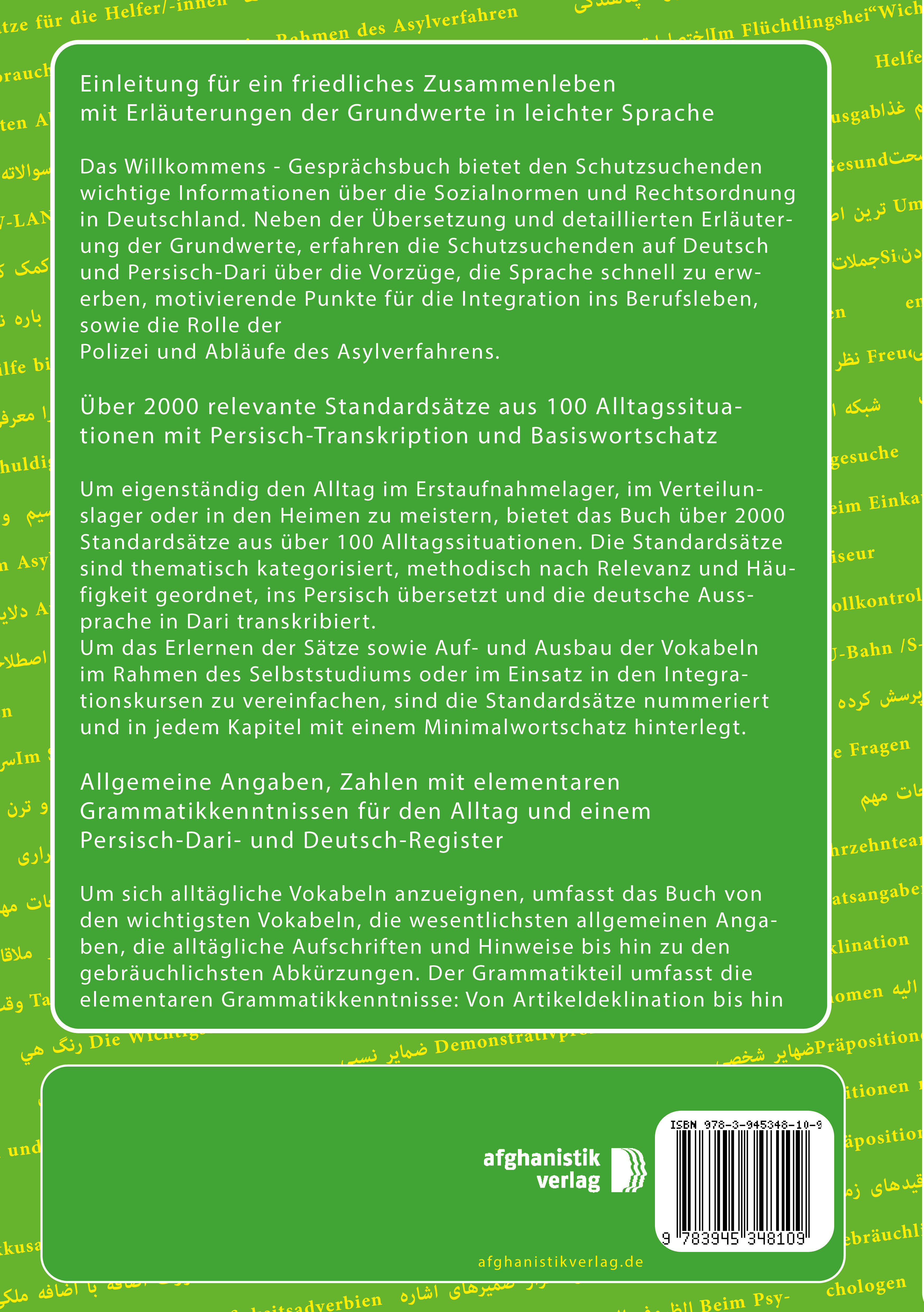 Das Willkommens-Gesprächsbuch richtet sich an Flüchtlingen aus Afghanistan nach Deutschland, Österreich und Schweiz zugewandert sind. Es richtet sich an Anfänger, die Deutsch schnell lernen wollen. Das Buch hilft den Lesern ins Vokabelschatz aufzubauen und zu erweitern. Ebenfalls hilft das Buch Fortgeschrittene, die mehr sprechen möchten und ihre Kenntnisse einsetzen wollen.