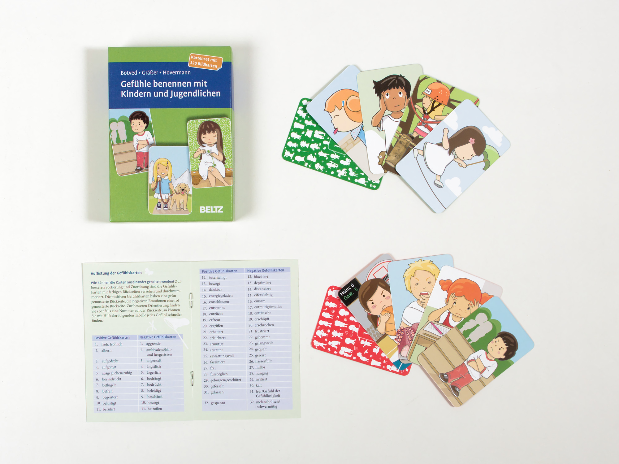 Diese Sammlung von 120 Gefühlskarten zeigt die gesamte Bandbreite von Gefühlen, positive wie negative. Über die dargestellten Bilder und Situationen kommen Therapeuten schnell und sicher mit den jungen Patienten über die verschiedensten Emotionen ins Gespräch und können erfolgreicher Lösungen für den Umgang auch mit schwierigen Gefühlen anbieten.